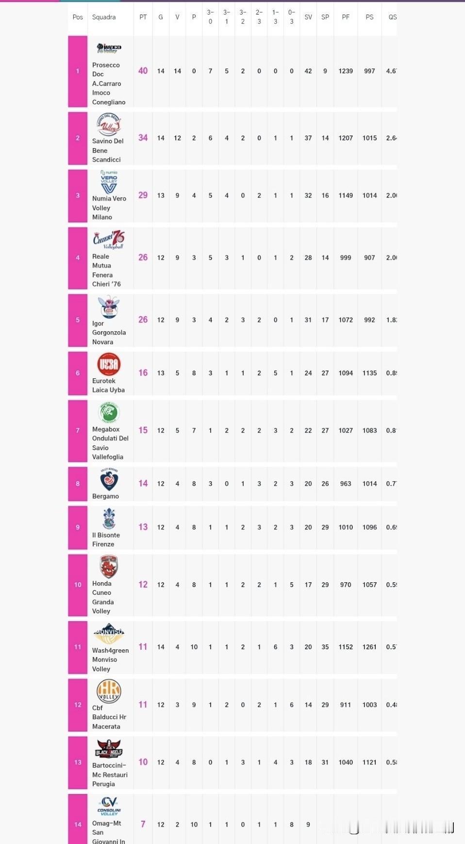 2025-2026赛季意大利🇮🇹女排联赛常规赛第十二轮结束,各队胜场积分排名如下。 1.科内利亚诺14胜0负,40分(多赛两场) 2.斯坎迪奇12胜2负,34分(多赛两场) 3.蒙扎(米兰)9胜4负,29分(多赛一场) 4.基耶里9胜3负,26分 5.诺瓦拉9胜3负,26分 6.布斯托阿西齐奥5胜8负,16分(多赛一场) 7.瓦莱福利亚5胜7负,15分 8.贝加莫4胜8负,14分 9.佛罗伦萨4胜8负,13分 10.库内奥4胜8负,12分 11.皮内罗洛4胜10负,11分(多赛两场) 12.马切拉塔3胜9负,11分 13.佩鲁贾4胜8负,10分 14.圣乔瓦尼2胜10负,7分