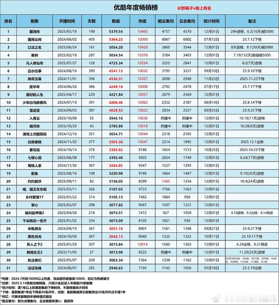 优酷经典畅销榜(拉新年榜)🌴榜上有名小组:野萌子12.1新闻女王2 上升到29名,白夜破晓下榜,执法者们返榜拉新>5300万:藏海传、墨雨云间拉新>5000万:以法之名、难哄拉新>4500万:凡人修仙传、边水往事、珠帘玉幕拉新>4000万:度华年、蛮好的人生、少年白马醉春风、雪迷宫入青云3900+万,暗河传3700+万