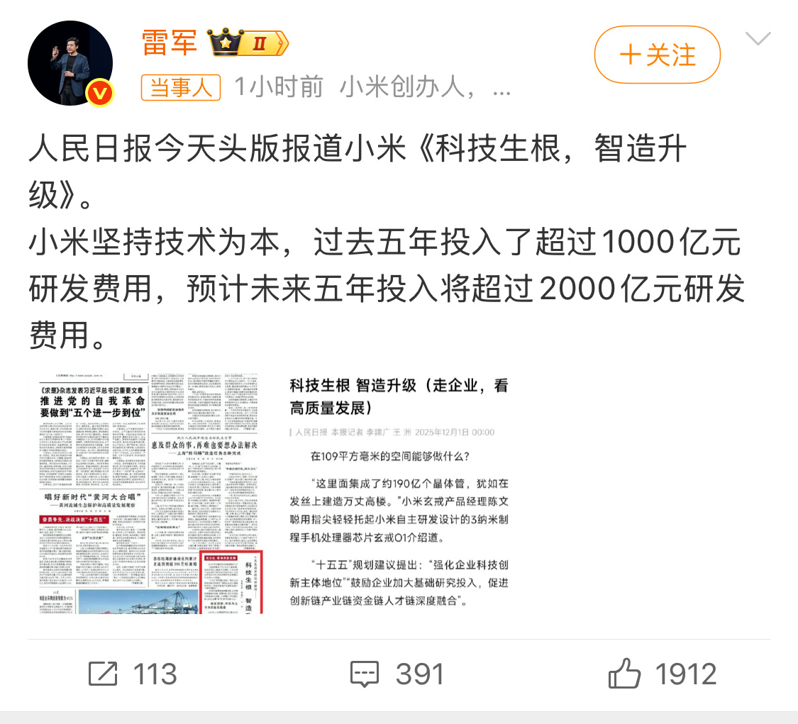 雷军强调小米坚持技术为本雷军说小米坚持以技术为本。过去五年和未来五年,预计投入研发费用超3000亿元。华为也是坚持走技术路线的,去年一年投入的研发费用达1797亿元,都是优秀的中国企业。