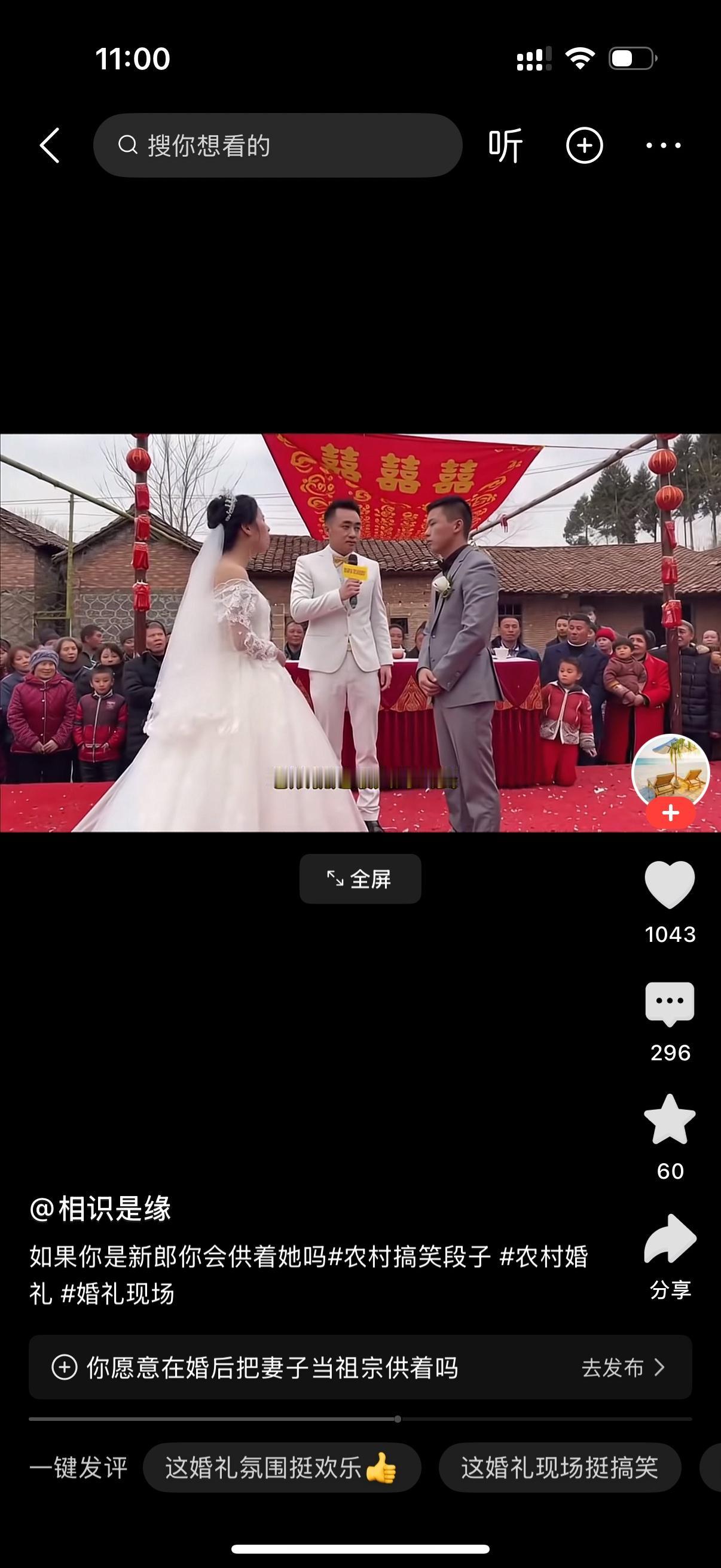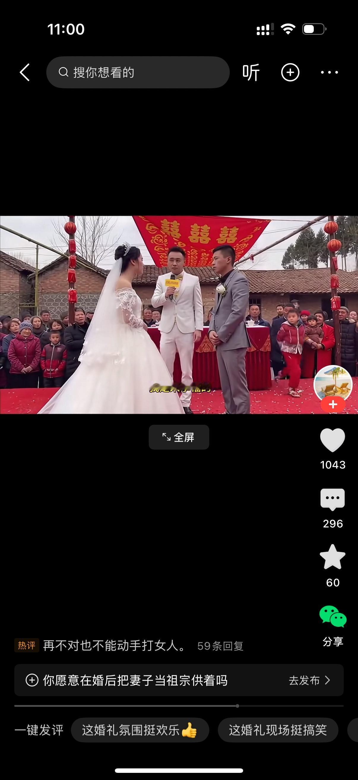 男主持人问新娘,在这个大喜的日子,你有什么想说的吗?新娘对着新郎说,在这个家里,老娘就是最大的公婆。你们都要听我的,我是来享福的,你们得把我当祖宗供着。新郎听完,感觉好没面子,怒火中烧,飞起一脚就踢向新娘。新娘被踢得趴在新郎面前,一副俯首称臣的模样,完全没了刚才的霸气。