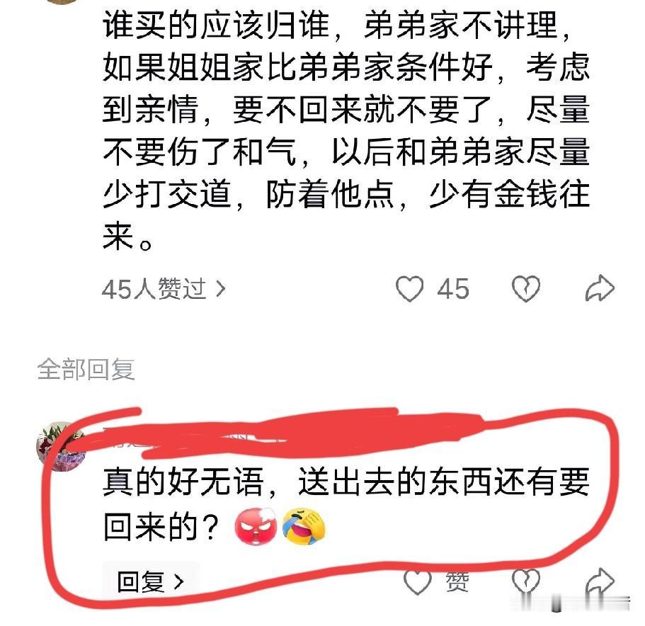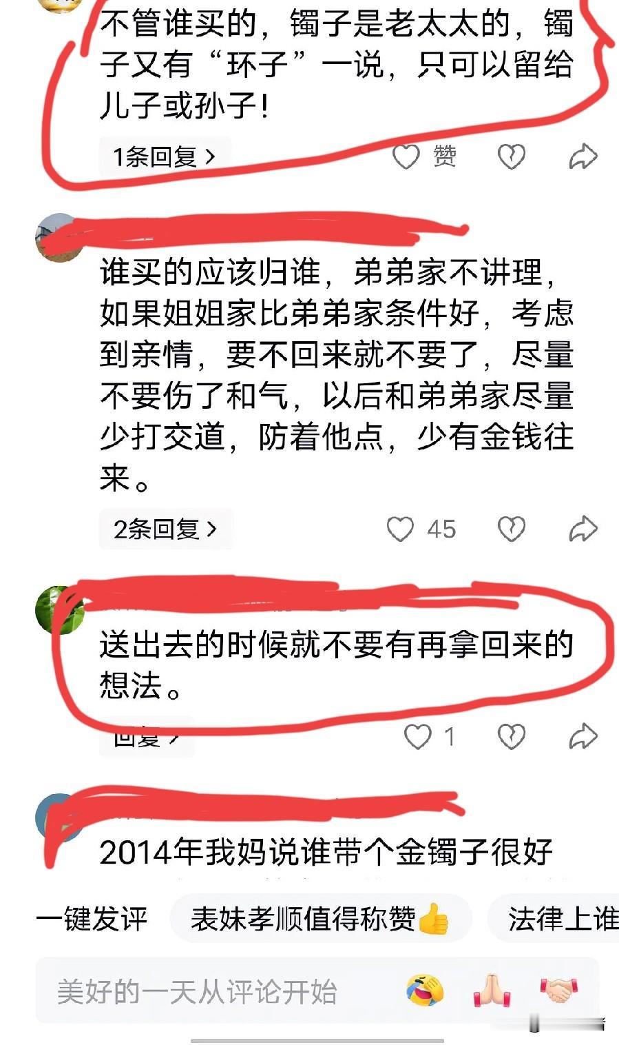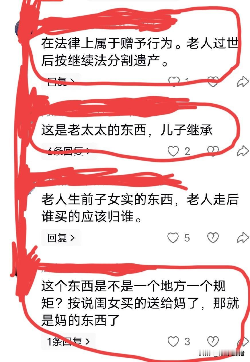 看到有些网友评论闺女给母亲买的金饰就该归兄弟了,三观真的碎了一地。把这么龌龊的想法说的理直气壮,我都怀疑我的想法是不是错了。当初我妈没有金耳环,整天戴一对银的,我看别的妇女都有金的,就给我妈买了一副6克多的。我妈当时说以后她老了就还给我,后来我又给买了一个金佛可能是9克多点,21年的时候又给我妈买了一个8克多的戒指。当时全家人都在我妈还是那句话,谁买的以后留给谁。当时我嫂子也说了网友一样的话,买了还想拿回去?好名声落了,一点不损失!我当时也没在意这句话,我始终认为谁买的当然归谁,这不是天经地义吗?