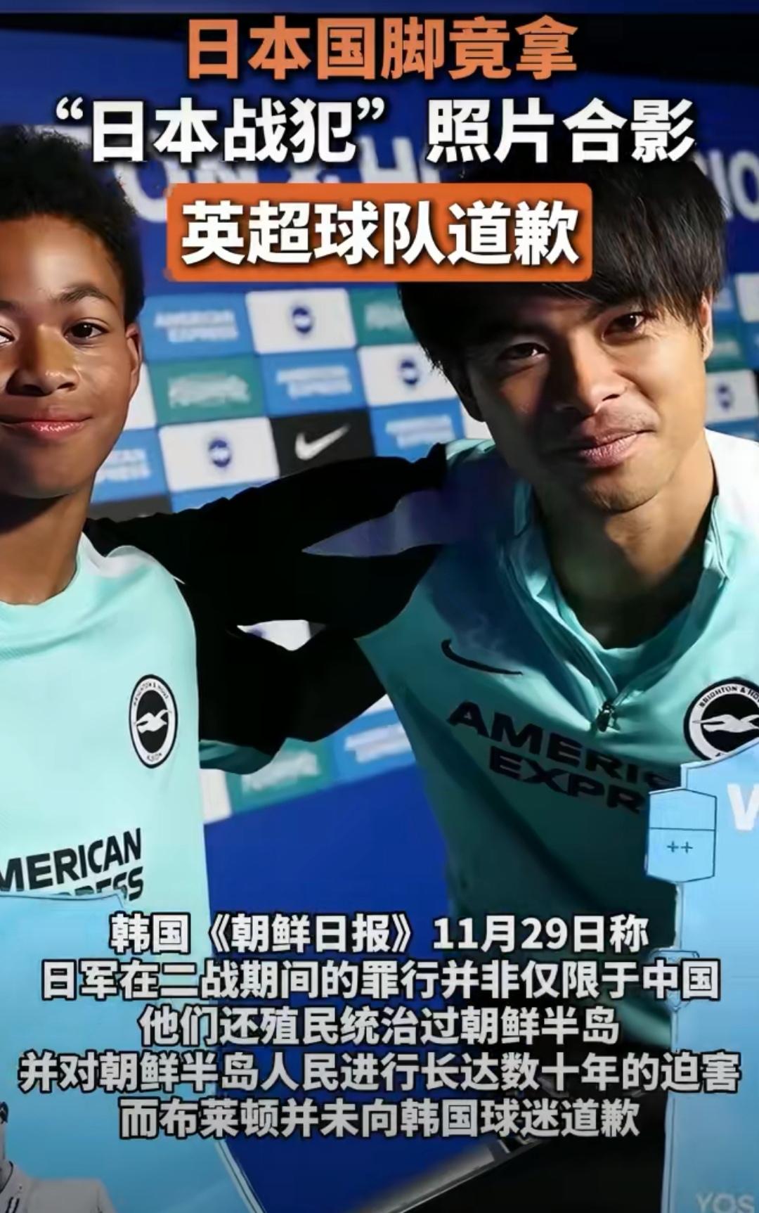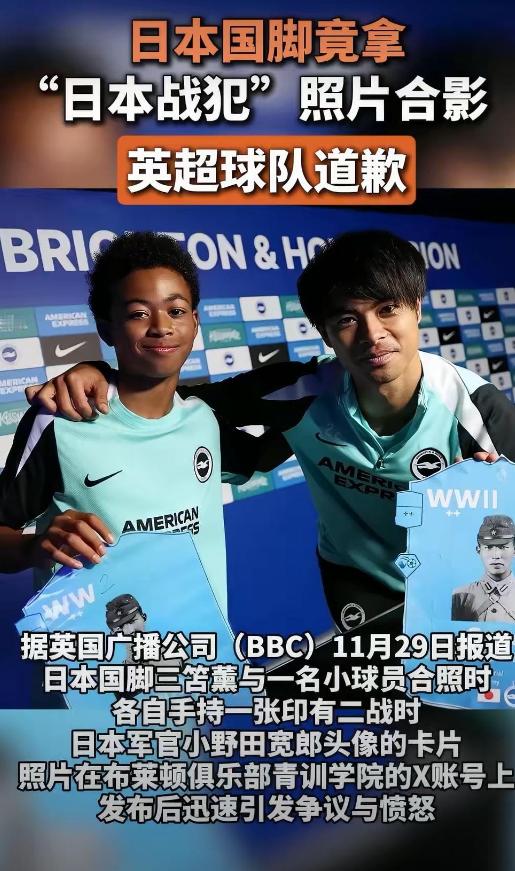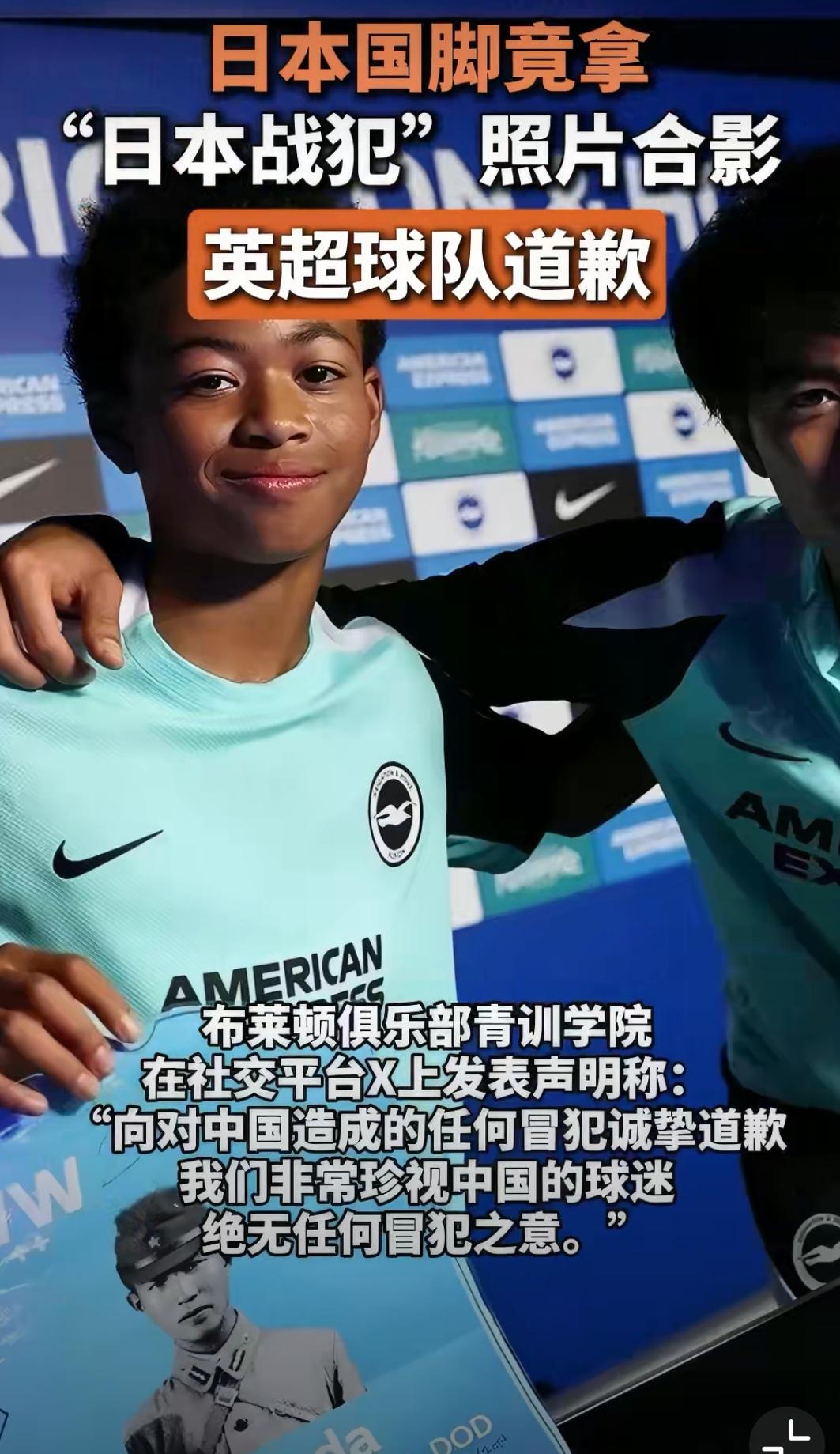 英超布莱顿俱乐部当天就其社交媒体上一张引发争议的图片向中国道歉,图中,日本国脚三笘薰与一名小球员各自手持一张印有二战时日本军官小野田宽郎头像的卡片。 韩国和菲律宾的网民也提出了抗议,认为布莱顿俱乐部也应该向他们道歉! 英超布莱顿俱乐部第一时间选择向中国道歉,这在以前是不可想象的,祖国的强大在这一刻得到了具象化。为祖国点赞,祝愿祖国繁荣昌盛,国泰民安!