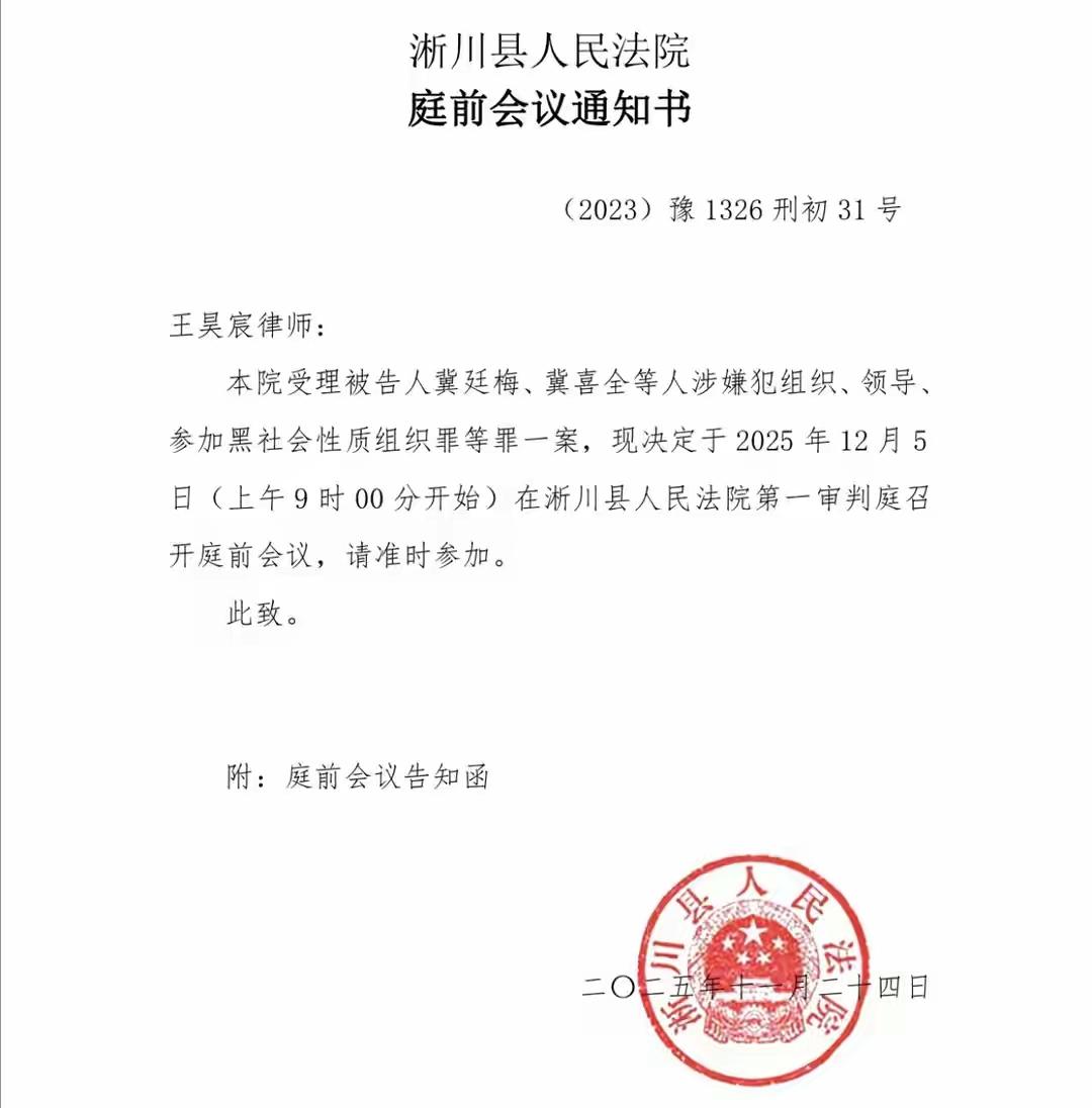 为母辩护的原法官,被取消辩护资格 关于2025年11月21日南阳市淅川县人民法院通知毕祺祺已失去辩护人资格,以及其母冀廷梅等人的涉黑案将于12月5日召开的消息,目前公开信息显示如下: 毕祺祺失去辩护人资格:法院在通知中指出,毕祺祺已不再拥有辩护人资格。这可能是由于辩护律师与其之间存在法律或程序上的变动,或是其他法律原因。具体原因未在公开报道中详细披露。 涉黑案庭前会议安排:冀廷梅等人在涉黑案件中的庭前会议定于12月5日举行。这是案件审理的重要环节,旨在明确案件的诉讼事项、证据交换、辩护安排等,为正式审判做准备。 案件背景:涉黑案件通常牵涉多方人员、涉案金额巨大、社会影响较大。法院安排庭前会议,有助于案件的顺利推进,同时也体现了司法机关依法办案的严肃态度。 目前,关于此案的更多细节、案件的具体事实或涉案人数等,尚未全部公开。公众关注此案的同时,也应尊重司法程序,等待法院依法审理的结果。 如需了解最新进展,建议关注法院公布的官方公告或权威新闻渠道,以获取准确、权威的信息。