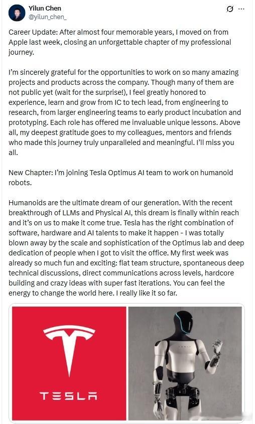 苹果的机器人工程师转投特斯拉了马斯克还希望特斯拉的机器人有一天能进行自我复制
