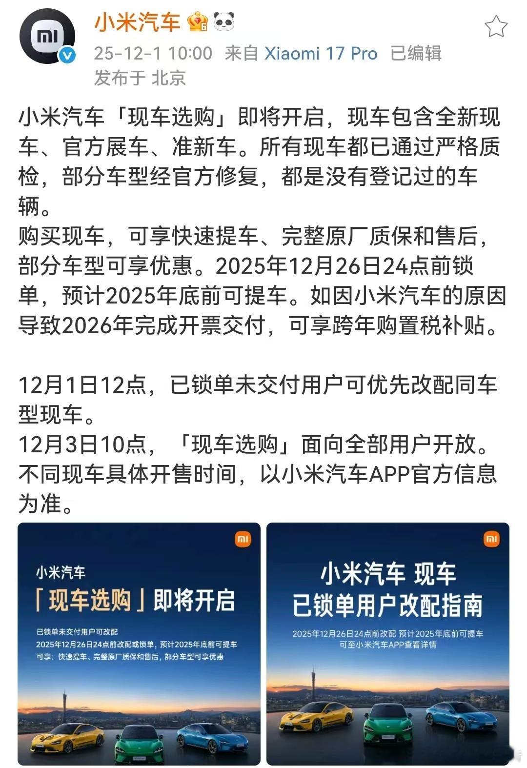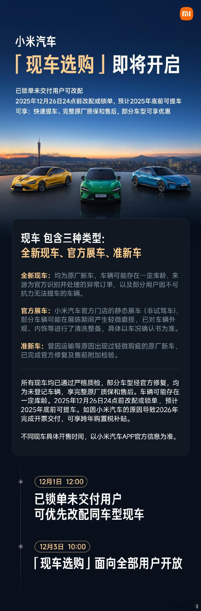 小米汽车现车选购即将开启12月1日,小米汽车「现车选购」即将开启,现车包含全新现车、官方展车、准新车。所有现车都已通过严格质检,部分车型经官方修复,都是没有登记过的车辆。购买现车,可享快速提车、完整原厂质保和售后,部分车型可享优惠。2025年12月26日24点前锁单,预计2025年底前可提车。如因小米汽车的原因导致2026年完成开票交付,可享跨年购置税补贴。雷军强调小米坚持技术为本小米汽车现车选购