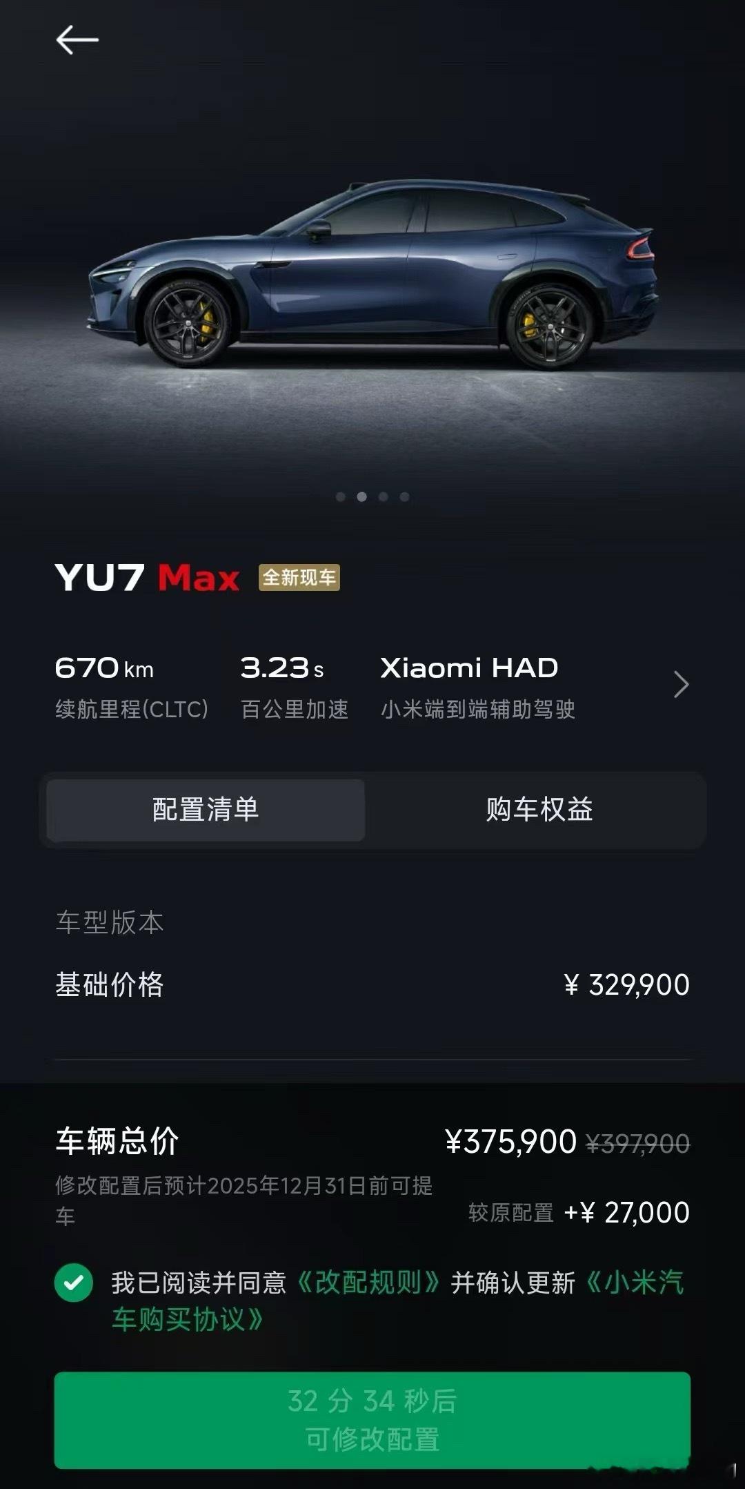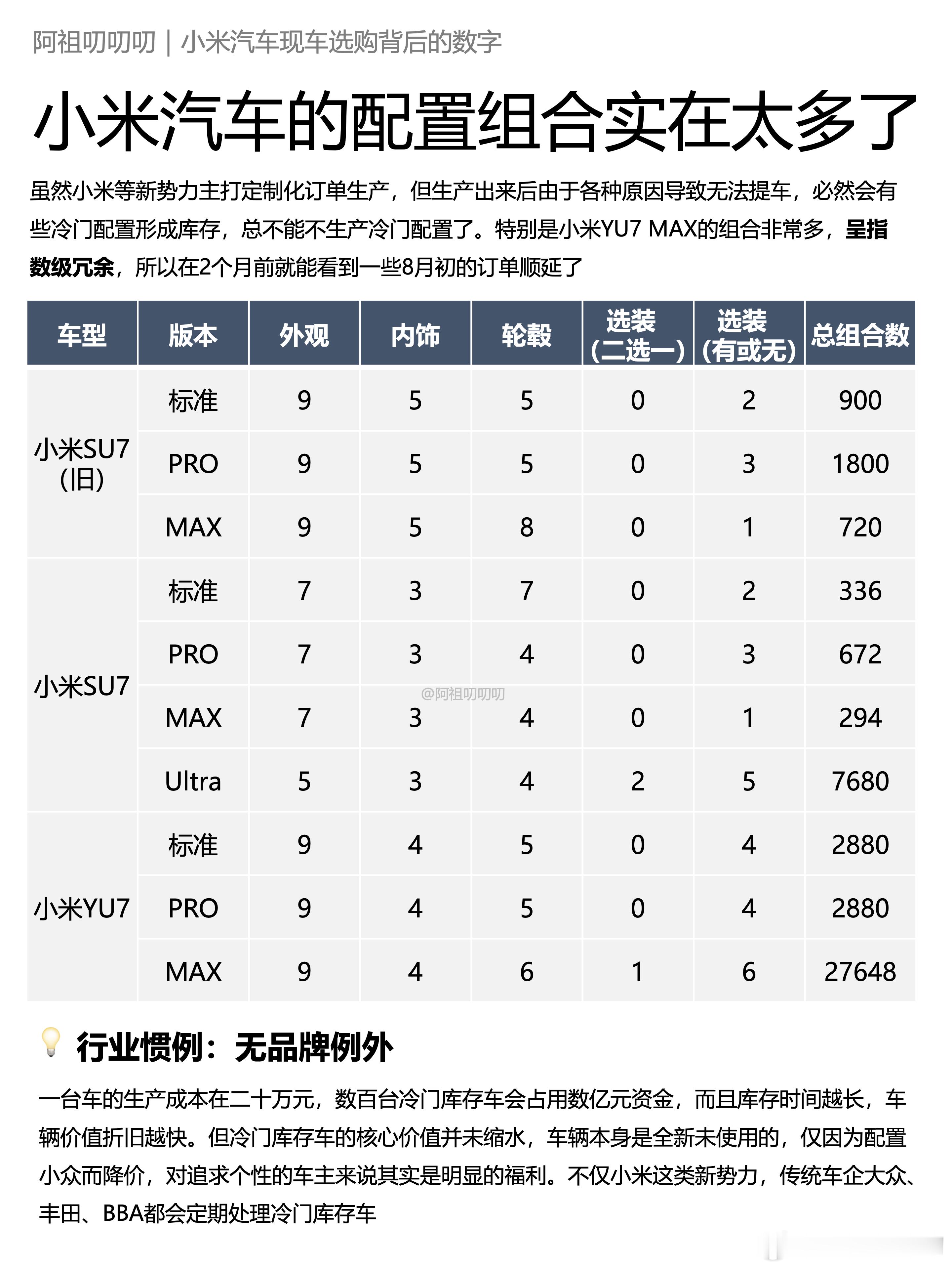 小米yu7 有27648种选择,小米汽车的配置组合实在太多了虽然小米等新势力主打定制化订单生产,但生产出来后由于各种原因导致无法提车,必然会有些冷门配置形成库存,总不能不生产冷门配置了。特别是小米YU7 MAX的组合非常多,呈指数级冗余,所以在2个月前就能看到一些8月初的订单顺延了一台车的生产成本在二十万元,数百台冷门库存车会占用数亿元资金,而且库存时间越长,车辆价值折旧越快。但冷门库存车的核心价值并未缩水,车辆本身是全新未使用的,仅因为配置小众而降价,对追求个性的车主来说其实是明显的福利。不仅小米这类新势力,传统车企大众、丰田、BBA都会定期处理冷门库存车,属于行业惯例,无品牌例外小米汽车