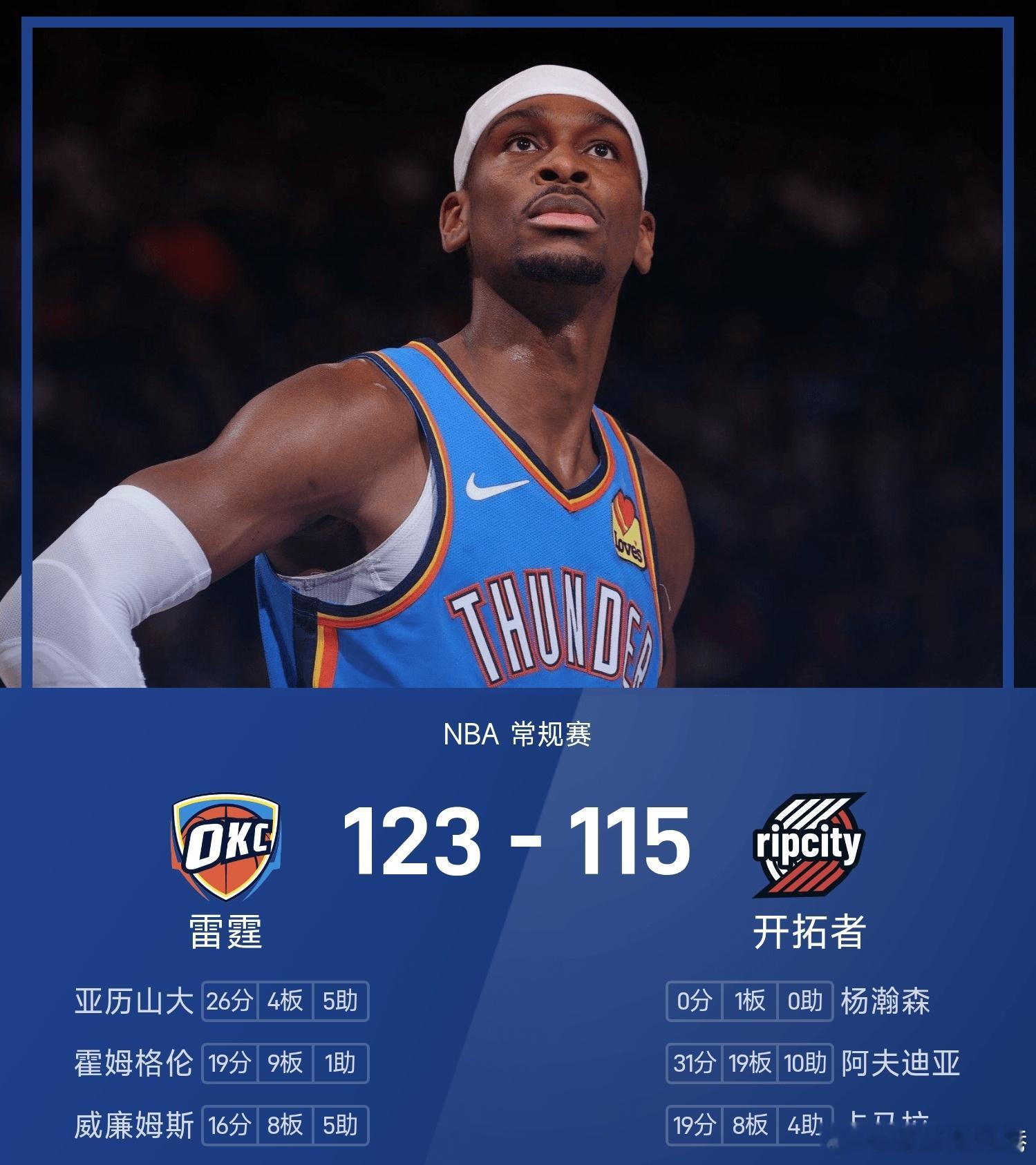 雷霆vs开拓者 开拓者114-123不敌雷霆。亚历山大得到26分4板5助率队取胜,阿夫迪亚空砍全场最高的30分19板10助。