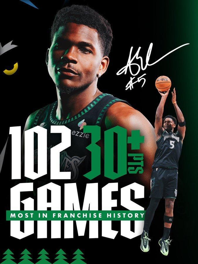森林狼战胜马刺爱德华兹,生涯第102场30+,队史第一,超过唐斯没办法,队史,确