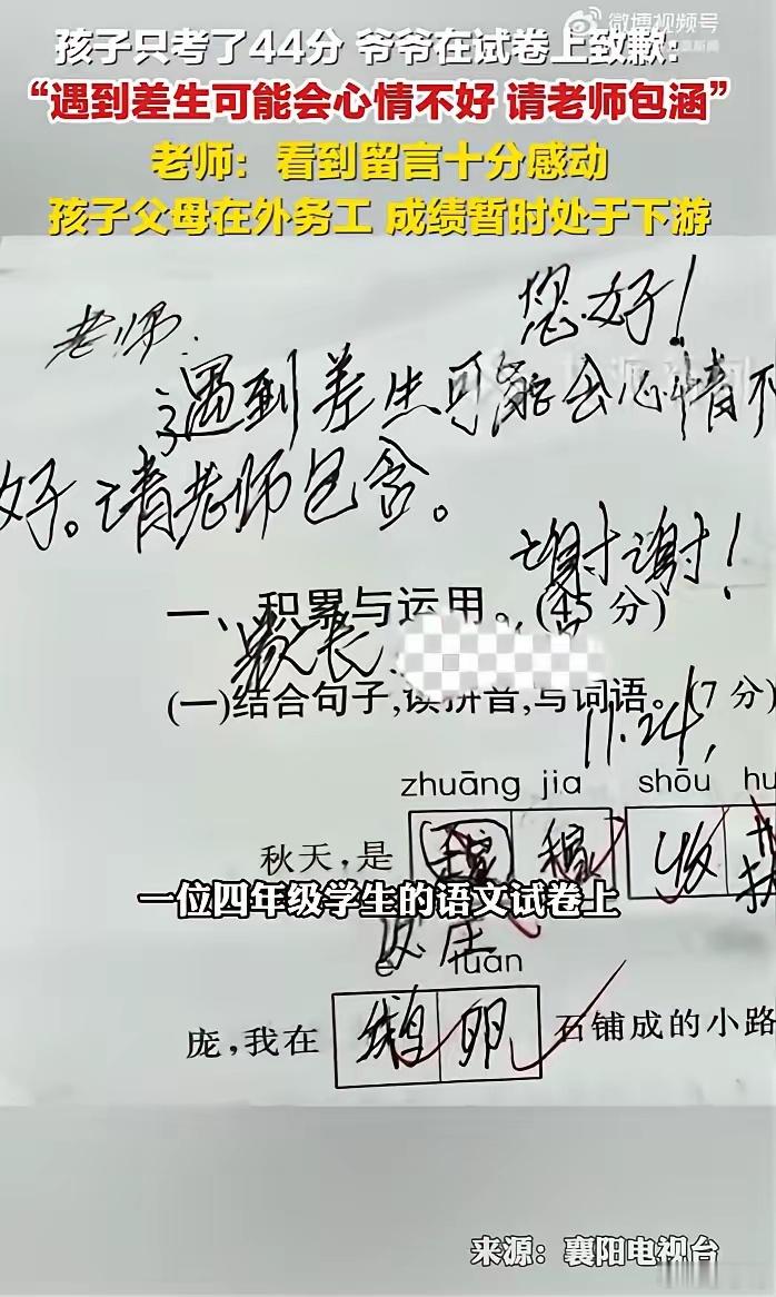 老师回应爷爷在44分试卷留言请包涵这位爷爷的留言不仅打动了老师,也戳中全网的泪点,这哪是卑微,是隔代教养的无奈与深情啊!当前我国还有1550多万留守儿童,太多孩子像他这样,跟着祖辈长大,缺了父母的陪伴,连学习辅导都成了奢望。爷爷写在试卷上的不是歉意,是拼尽全力却帮不上忙的愧疚,是怕孩子被嫌弃的小心翼翼。分数从来不是成长的标尺,比起冷冰冰的数字,孩子的安全感、善良的底色才更珍贵。希望所有教育者都能明白:成绩差是暂时的,可被忽视的童年是一辈子的。热点观点