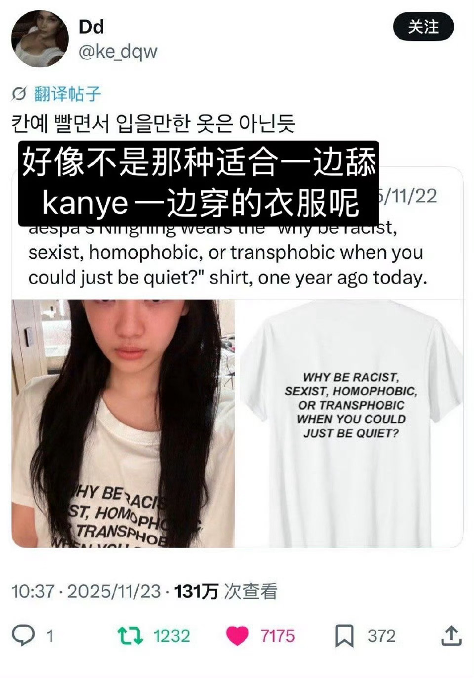 韩网热议🔥宁艺卓穿着不要性别歧视种族歧视恐同的T恤时韩国人表示:“好像不是那种适合一边舔kanye一边穿的衣服呢”对此粉丝表示:“可能有人不太了解kanye干了什么,只听歌就行了嘛”结果又被韩国人杉飞❗“孩子,说点靠谱的话吧!”