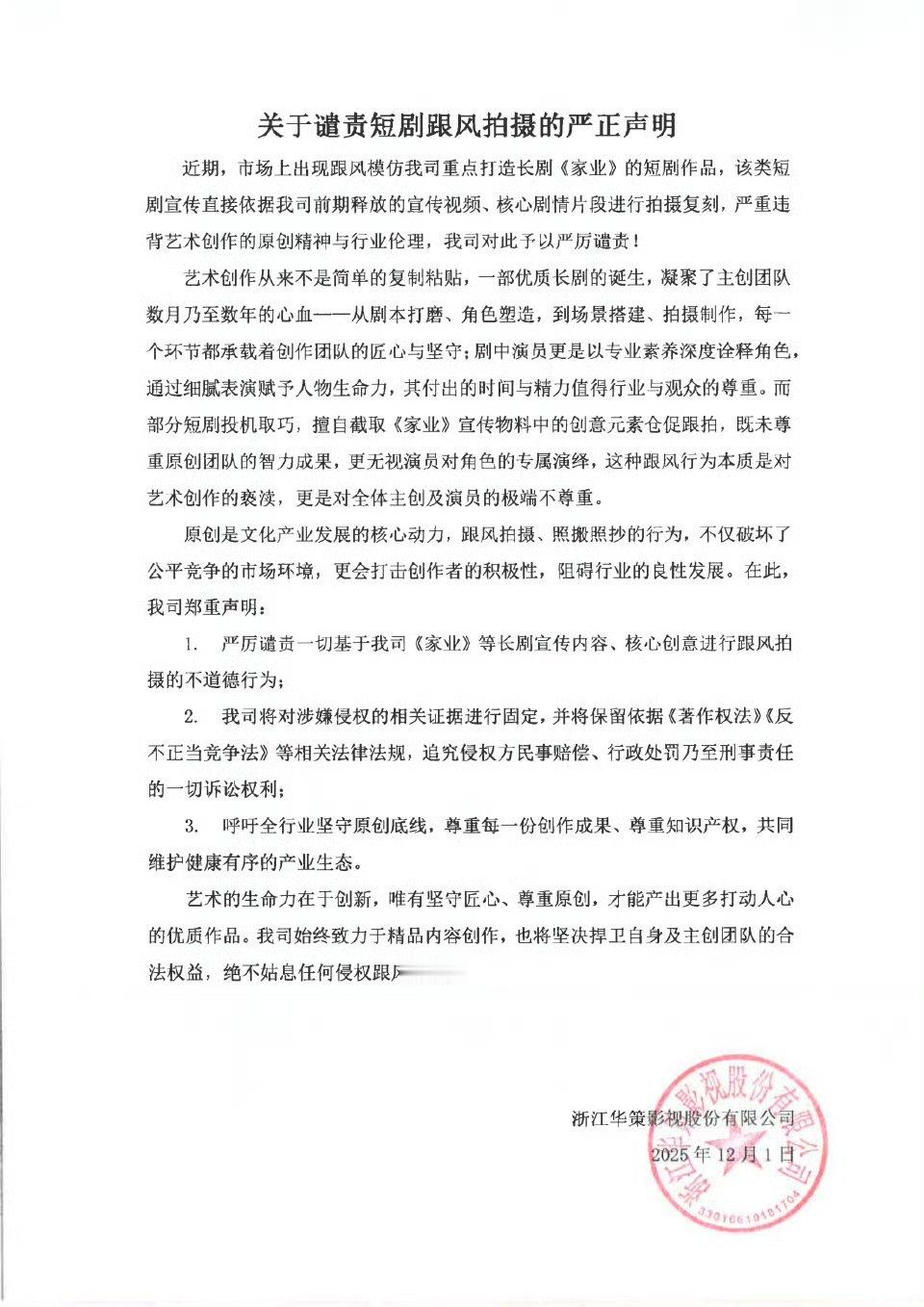 华策影视谴责短剧跟风拍摄家业华策谴责跟风拍摄家业华策发布声明谴责短剧跟风拍摄家业