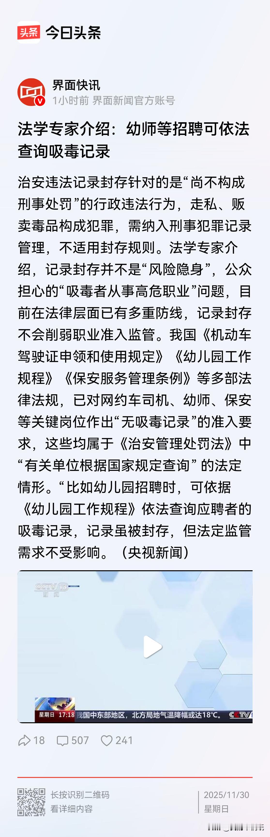 封存违法记录,是在给谁铺红毯? 新《治安管理处罚法》规定违法记录应封存,舆论炸了。最刺眼的争议是:吸毒、嫖娼等恶行记录,凭什么一并“隐身”? 一边说这是法治进步,给悔改者重生之路。另一边质问:缉毒警察的血白流了吗?黄赌毒害人害社会,封存记录岂非变相“洗白”? 细想令人心惊:一个大学生因打架被学校公开处分,求职可能受阻;而另一个曾有吸毒记录的学生,因记录被封存,反而可能“清清白白”地进入职场。这公平吗?违法代价究竟由谁承担? 法律当然要给改过自新者机会。但机会不等于“一键删除”。对挑战社会底线、危害他人健康的违法行为,封存记录是否削弱了法律的震慑力?当婚姻对象无从知晓伴侣的吸毒史,当教师岗位无法排查曾经的违法行为,公众的安全感谁来守护? 重建信任,不能以掩盖真相为代价。法治的光,该照亮改过者的前路,但绝不该照不到他们身后那些曾被伤害的人、和仍在守护这条底线的人。 封存制度需要温度,更需要刻度。有些过错,或许不该轻易“翻篇”。 封存吸毒记录