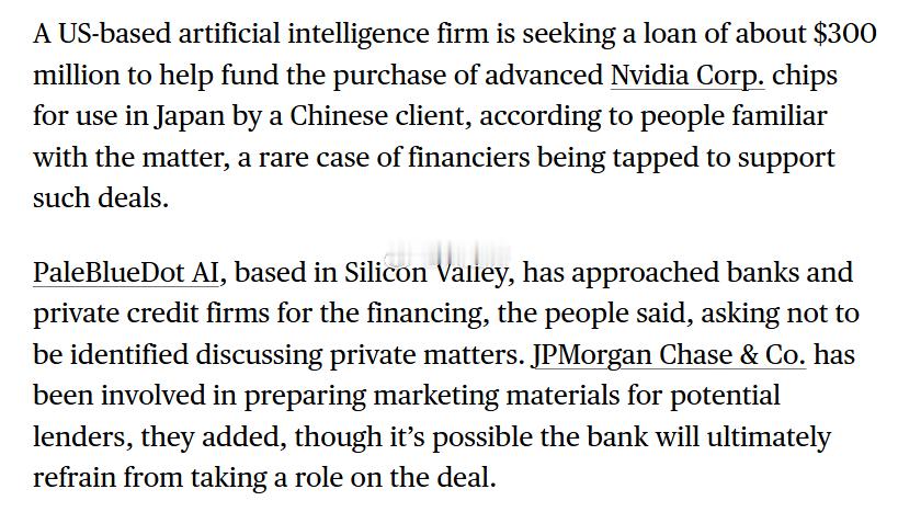 彭博:总部位于硅谷的PaleBlueDot AI正在寻求约3亿美元的贷款,以帮助其客户在日本购买英伟达公司的先进芯片。知情人士透露,这些芯片将用于位于东京的数据中心,而最终用户将是小红书。PaleBlueDot AI发言人回应称,“彭博的信息与事实不符”。