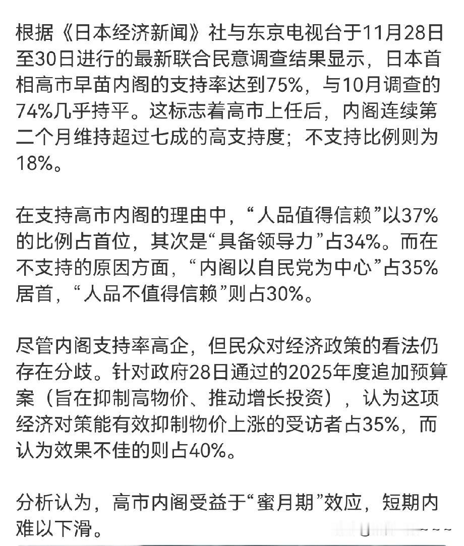 我去!【高市早苗内阁支持率升至75%?】 不知道这“日本经济新闻”靠不靠谱? 有的人说不靠谱,毕竟这是高市内阁控制的新闻,这支持率说让她高一点就高一点,说让她低一点就低一点,这明显的是高市在操纵舆论。 有的网友则认为,这支持率测评是大差不差,毕竟,日本人内心里军国主义思想还是有的,看看他们自己把教科书都改了,脑子都给洗了就是原因之一! 我认为日本经济进一步下滑是必然的,如果日本老百姓,日本选民,日本参加支持率测评的人,口袋里都没钱了,那么,未来高市的支持率下降是一定的。 对此,大家怎么看?