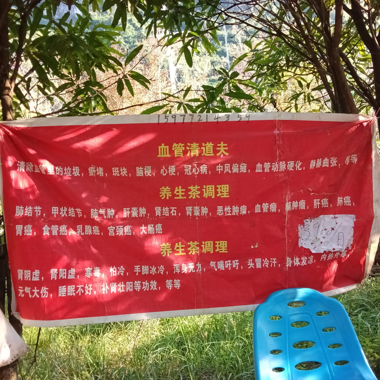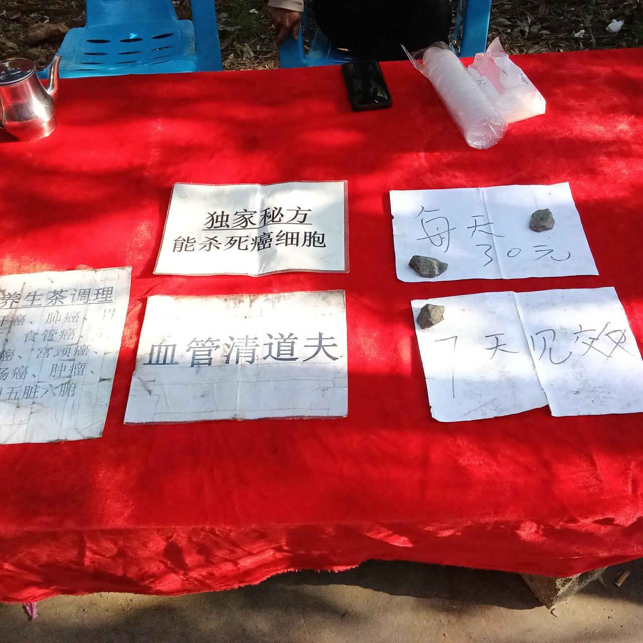 每天花30元喝茶就可以让你癌症消除。你相信吗? 在广西巴马县坡月村通向百磨洞的山坡上有一个摊位吸引了众人的目光。 摊位挂着一面宣传标语上述治疗各种疾病(见图片三)。 摊位有两张桌子和几把椅子构成。老板是云南人。桌子上摆着几张宣传纸有一张是这样写的: “专治癌症”(见图片一)。 由于是下午摊位上并没有人,老板介绍说这里只在上午提供茶饮需要喝茶每位30元。一天喝一个多小时即可。一周可以看到转化,半个月保证见效。 摊主还介绍近日有一位肺癌晚期患者没有手术,没有放化疗,只来巴马做最后的努力喝茶半月有了很大改观。从前不爱说话转移部位疼痛目前都有很大改善。 当然,这只是摊主的介绍。如果可能,我准备明天上午去一探究竟。 民间秘方有些的确有他过人之处。这个我是相信的朋友,您相信吗?