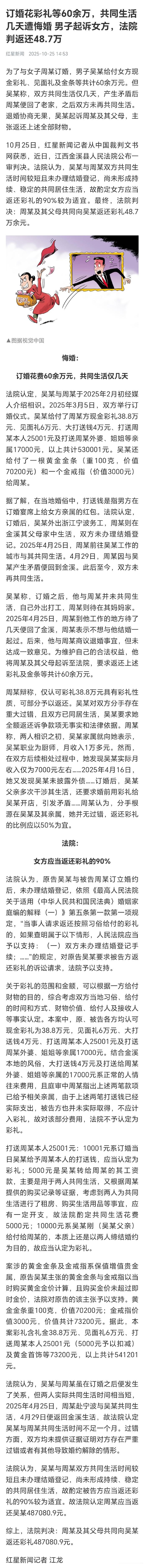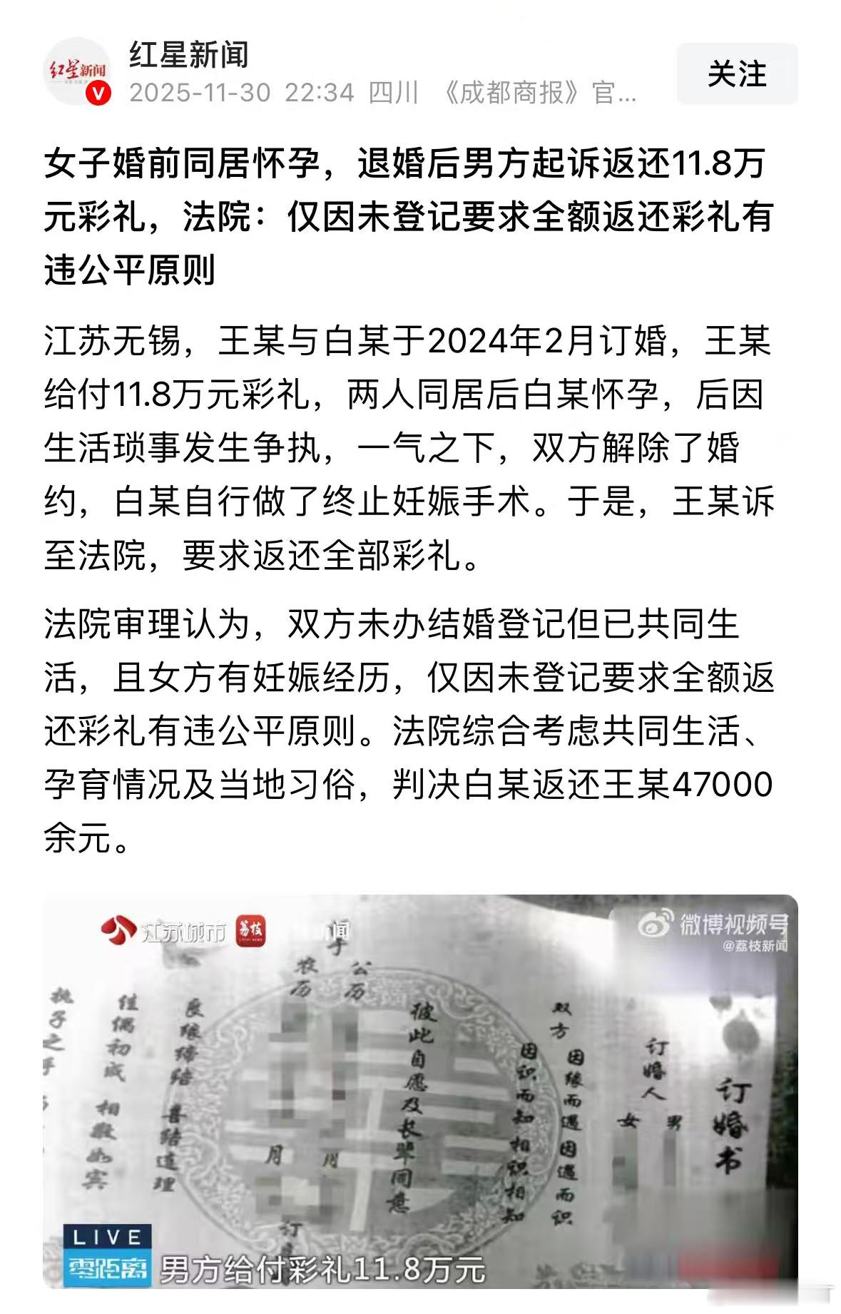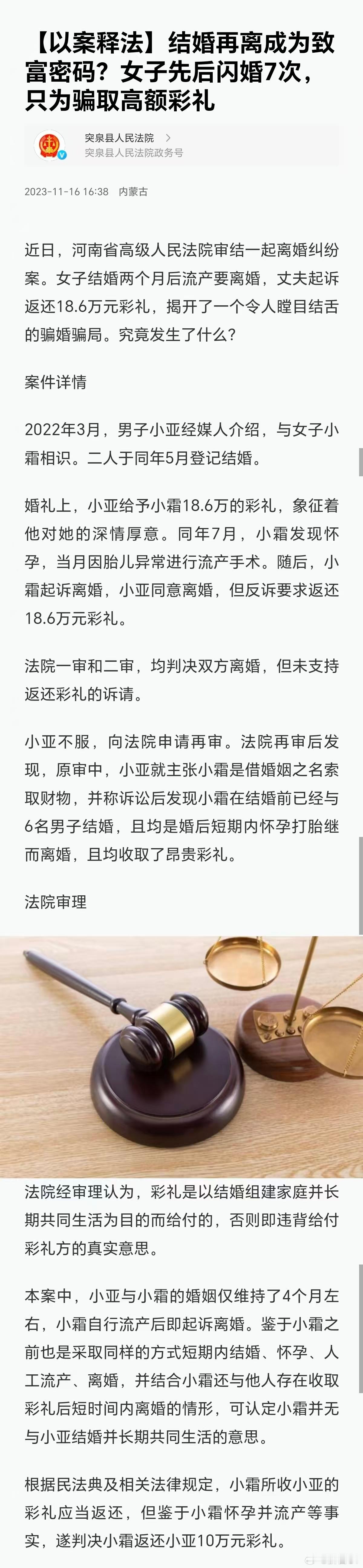 这个案子的判决,整体上没什么太大的问题。现在的彩礼返还比例,看的就是共同生活时间长短及是否妊娠等情节。是否领证结婚,已经不再是硬性要求了。这个案子,给的是11.8万,返还了4.7万,比例差不多是40%。有同居史,还有怀孕等因素,姑且算正常。真论奇葩判例,前段时间的给付60万彩礼,同居仅4天就悔婚,最终判决返还48.7万,才算离谱中的离谱。至于有人说,骗婚的不会怀孕打胎。这个就是纯粹的见识浅薄了。曾经有地方法院披露案例,有个女的前后7次闪婚闪离,期间伴有怀孕打胎等骚操作。最后一次是要了18.6万彩礼,法院判决返还10万。男方起诉退还全部彩礼婚前同居怀孕退婚后男方起诉要彩礼