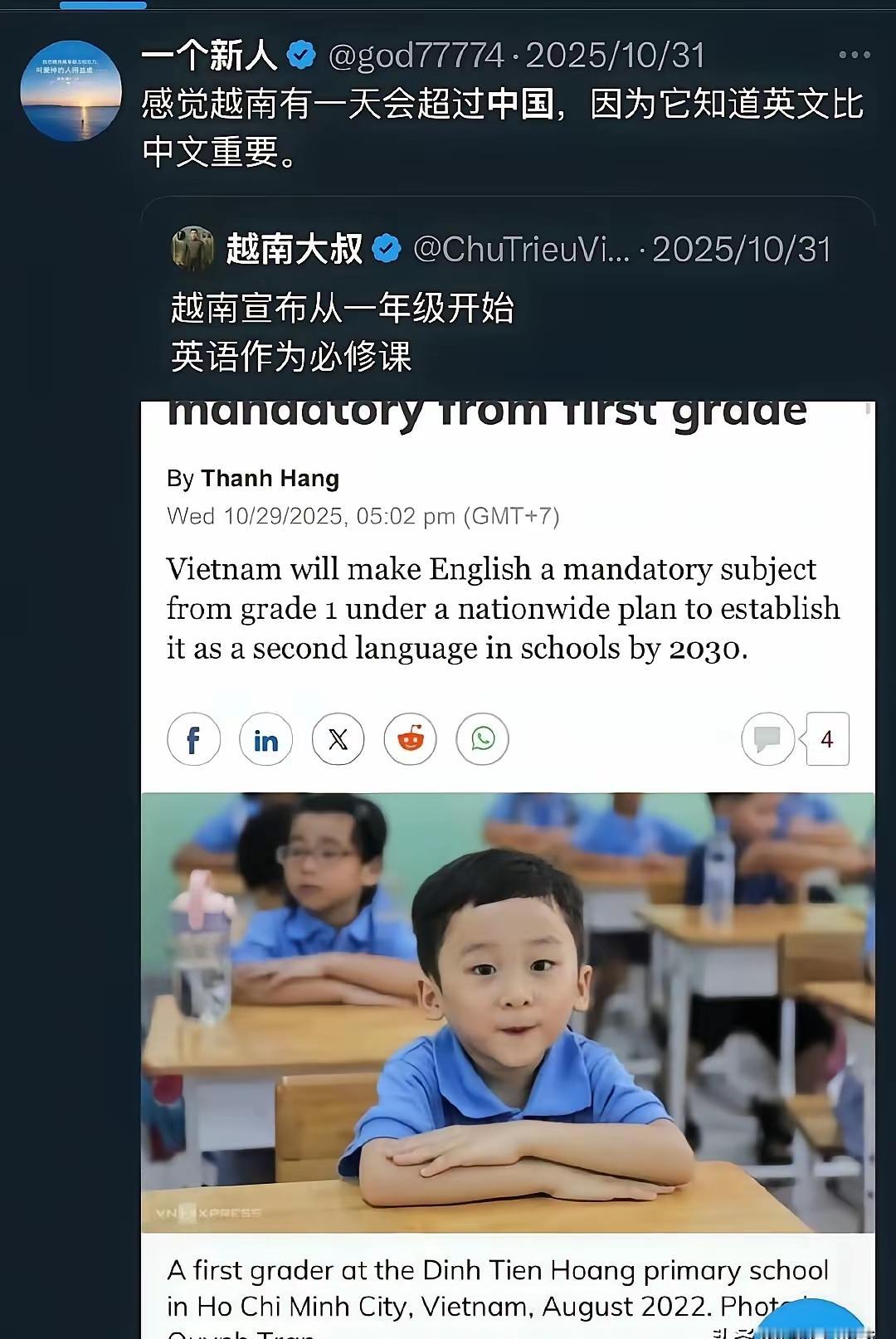这个越南人认为越南人经济会超越中国,理由是越南重视英语教育。 他认为越南人学好英语,就能和欧美国家接轨,迎来经济大发展。而中国不像越南一样重视英语教育。 菲律宾是越南的模板。 很多菲律宾懂了英语,就可以去白人英语国家做佣人了,工资还快到5千人民币!比越南的平均工资多了一半。 非洲国家那么多讲英语的,也没见富裕起来,印度也是英语国家,发展也是磕磕绊绊的。 建议越南先超越广东在说吧! 重视英语就能成为发达国家,这应该是一个笑话。