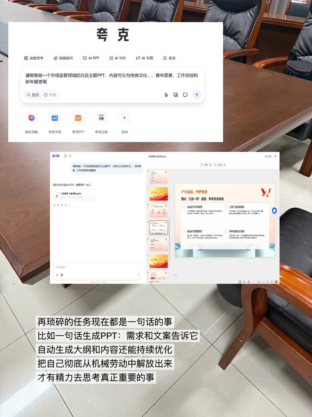 以前我的工作流程:查资料→开Word写稿→找模板做PPT→核对数据做表…在各网页间反复横跳。现在用夸克,一站式搞定: