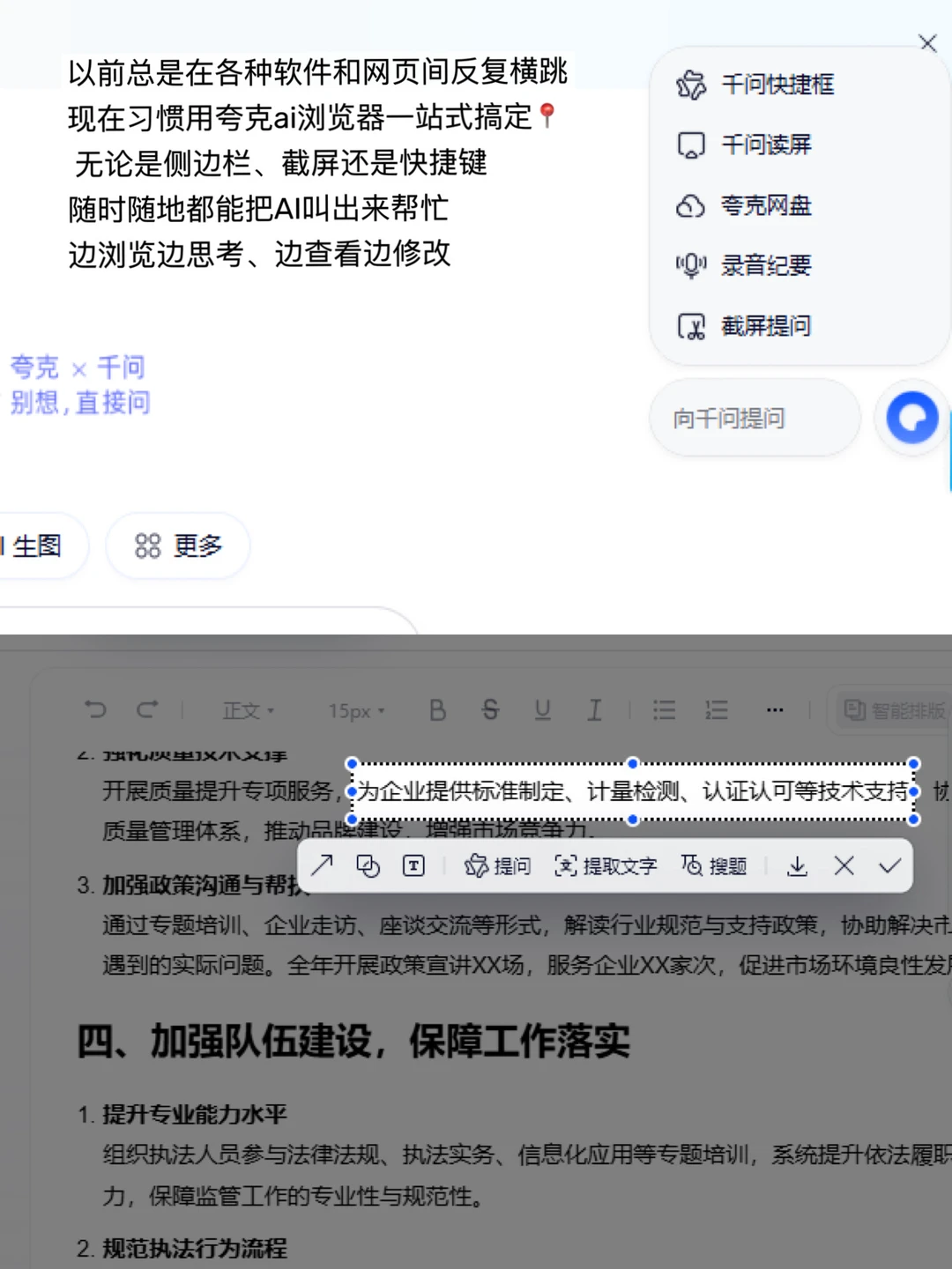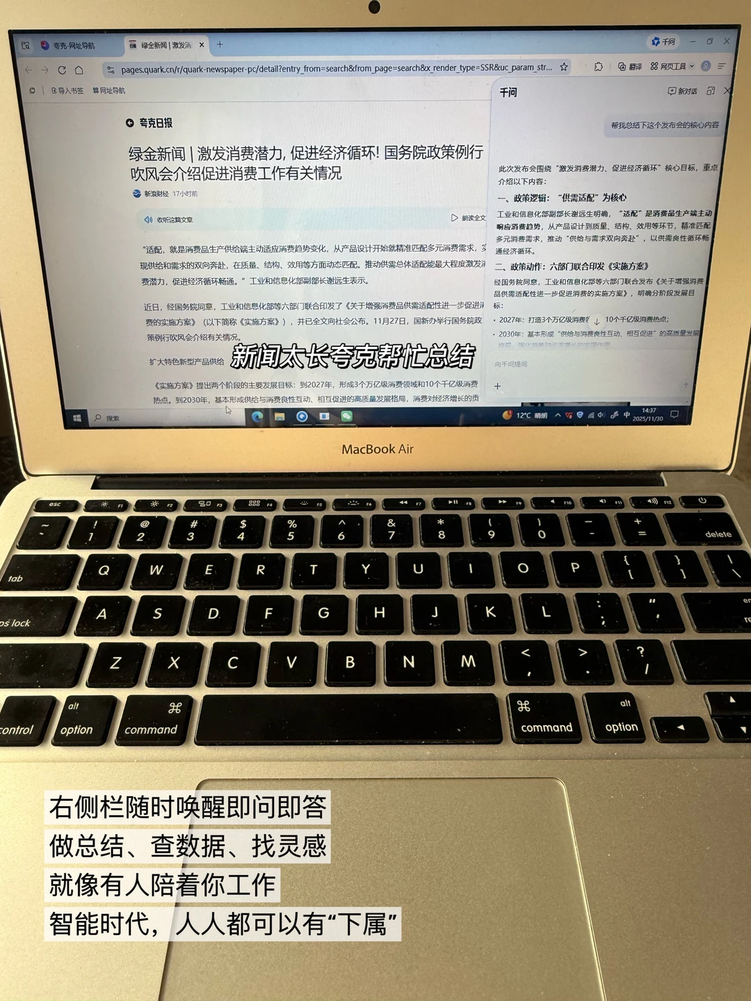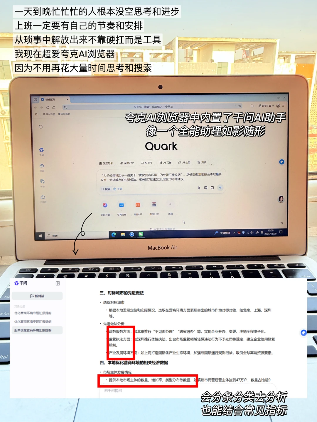 一天到晚忙忙忙的人没空思考和进步。上班一定要有自己的节奏和安排,解放琐事不靠硬扛靠工具🛠️我现在爱用夸克AI浏览器,因为不用再花大量时间思考和搜索,用AI高效搞定,它内置了千问AI助手,像全能助理如影随形。