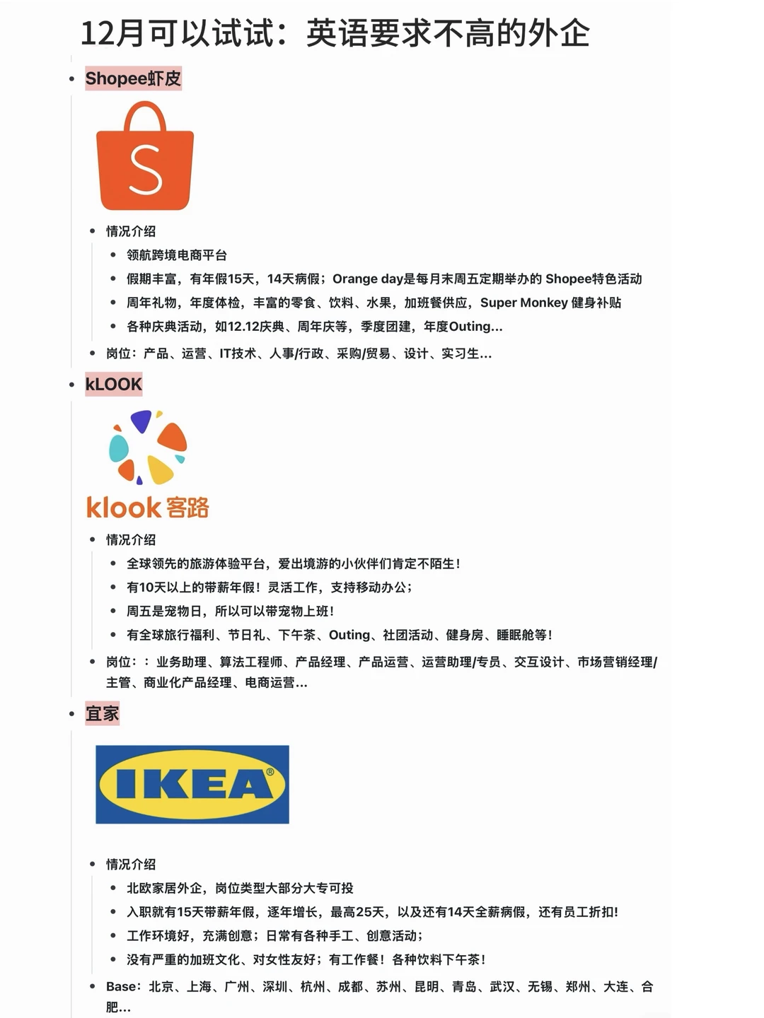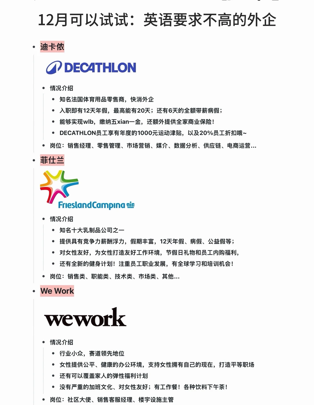 不要再因为“英语不行”就不敢投外企了,这篇笔记盘点了一批对英语超友好的神仙外企,12月很多外企都在这个时候集中补录,可以存一下 . 英语要求低的外企是存在的 ✔️面试可以全程中文,不考你即时口语 ✔️外企年假长,基本上是12天起步的 ✔️对女性友好,注重wlb,工作氛围轻松 . 坚持日更✊🏻,帮大家在找工作路上顺利拿到offer! .