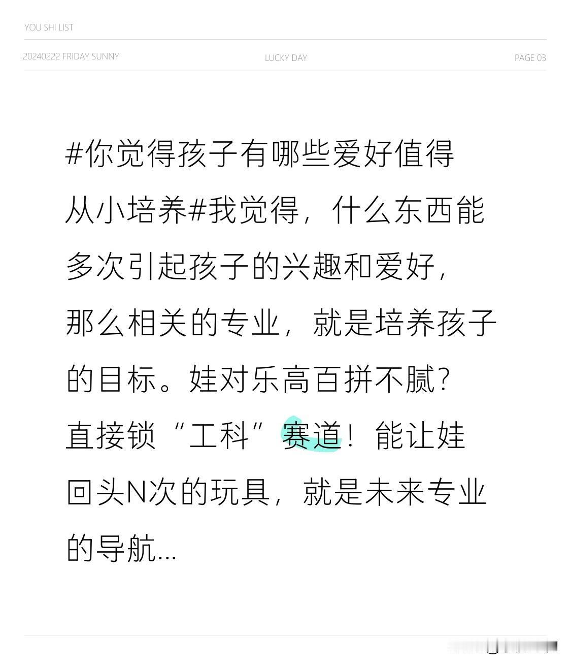 我觉得,什么东西能多次引起孩子的兴趣和爱好,那么相关的专业,就是培养孩子的目标。 娃对乐高百拼不腻?直接锁“工科”赛道! 能让娃回头N次的玩具,就是未来专业的导航针。 兴趣高频闪现=天选方向,别犹豫,顺着玩就能玩到吃饭碗里!