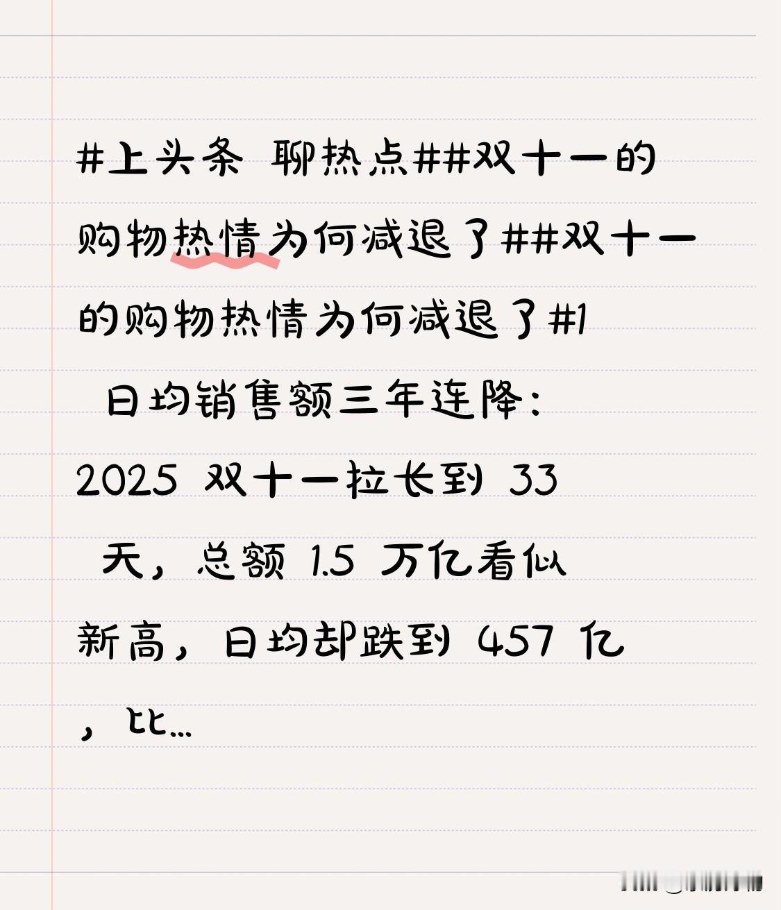 1️⃣ 日均销售额三年连降:2025 双十一拉长到 33 天,总额 1.5 万亿看似新高,日均却跌到 457 亿,比去年再缩水 11.3%,狂欢变“长摊”。 2️⃣ 价格套路疲劳:先涨后降、叠券盖楼、组队 PK……算完优惠比平日贵,信任被“反杀”,消费者直接躺平。 3️⃣ 钱包决定脑袋:房地产冷、就业难,收入预期打骨折,超七成年轻人把“是不是真需要”写进购物车,冲动囤货成过去式。 4️⃣ 天天都是双十一:直播电商 365 天“最低价”,拼多多百亿补贴常态化,稀缺感消失,谁还熬夜蹲 11 月 11 号? 5️⃣ 退货率吓退手:部分直播间服装退货率飙到 80%,买成“试用”,快递柜变试衣间,热情秒变社死现场。 当“便宜”不再是稀缺资源,双十一就从“剁手节”变成“数学期末考试”。 消费者毕业不考了,平台只好把“复杂奥数”改成“直降 到底”。 狂欢退潮,不是不买,而是回归那句老话:只买对的,不买贵的。