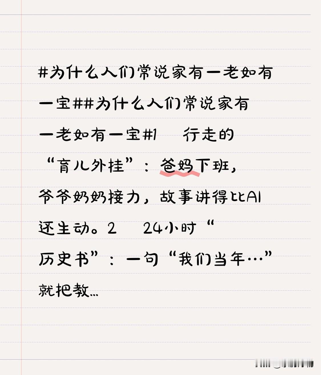 1️⃣ 行走的“育儿外挂”:爸妈下班,爷爷奶奶接力,故事讲得比AI还生动。 2️⃣ 24小时“历史书”:一句“我们当年…”就把教科书拍成真人秀。 3️⃣ 家庭“压舱石”:年货怎么腌、红包怎么包,有他们在,年味才不被外卖稀释。 4️⃣ 情绪“稳压器”:娃考砸了,爸妈炸毛,老人一句“我小时候也0分”瞬间灭火。 5️⃣ 银发“财神爷”:退休金=隐形红包站,逢年过节秒变娃的“零花赞助商”。 别把“老”当负担,那是家里偷偷运行的“外挂服务器”——缓存故事、缓冲情绪、赞助钱包。 有他们在,家才像U盘,随时插上就能读取温暖。