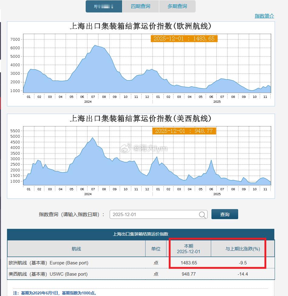 上海航运交易所数据:截至2025年12月1日,上海出口集装箱结算运价指数(欧洲航线)报1483.65点,与上期相比跌9.5%
