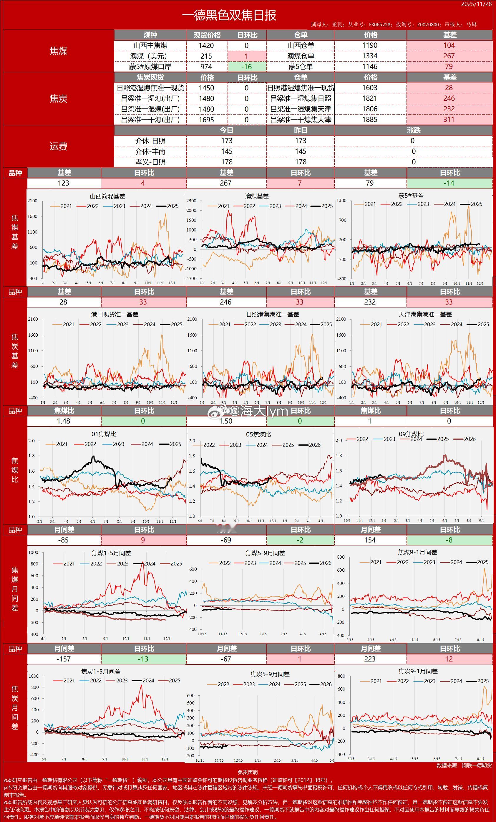 焦炭焦煤期货仓单成本,对标2601合约,焦炭2604合约以后交割规则有变动(以下数据来源:一德期货研报)焦煤期货:山西主焦煤1190蒙5精煤仓单1146焦炭期货:日照港湿熄焦准一现货仓单成本1603吕梁准一级湿熄焦日照港交割 1821吕梁准一级湿熄焦天津港交割 1806吕梁准一级干熄集天津港交割 1885焦煤期货焦炭期货