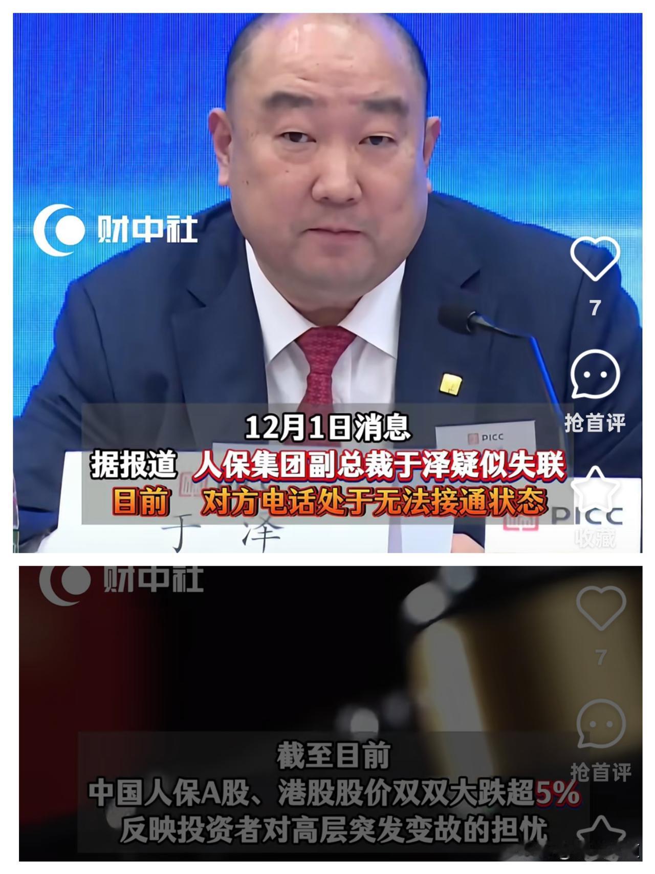 金融圈突发!财险龙头一把手被带走!股价大跌超6%…… 金融圈炸锅了!财险龙头一把手突然“失联”,股价直接崩了超6%! 这人可不是小角色,是人保集团副总裁兼人保财险总裁于泽,上周五还在公司开会,转头就没了消息,电话也打不通。要知道人保财险是行业绝对一哥,去年保费超5300亿,市场份额第一,现在掌舵人出这事儿,难怪资本慌了神。 有意思的是,不久前于泽还吐槽非车险行业乱象,结果刚过俩月自己就出事,有业内人说早有各种举报,并不意外。这事儿其实透着个信号:金融监管越来越严,哪怕是行业大佬,只要踩线就跑不掉。 不管官方后续怎么说,对普通投资者来说,行业龙头的人事震动都得多留个心眼。