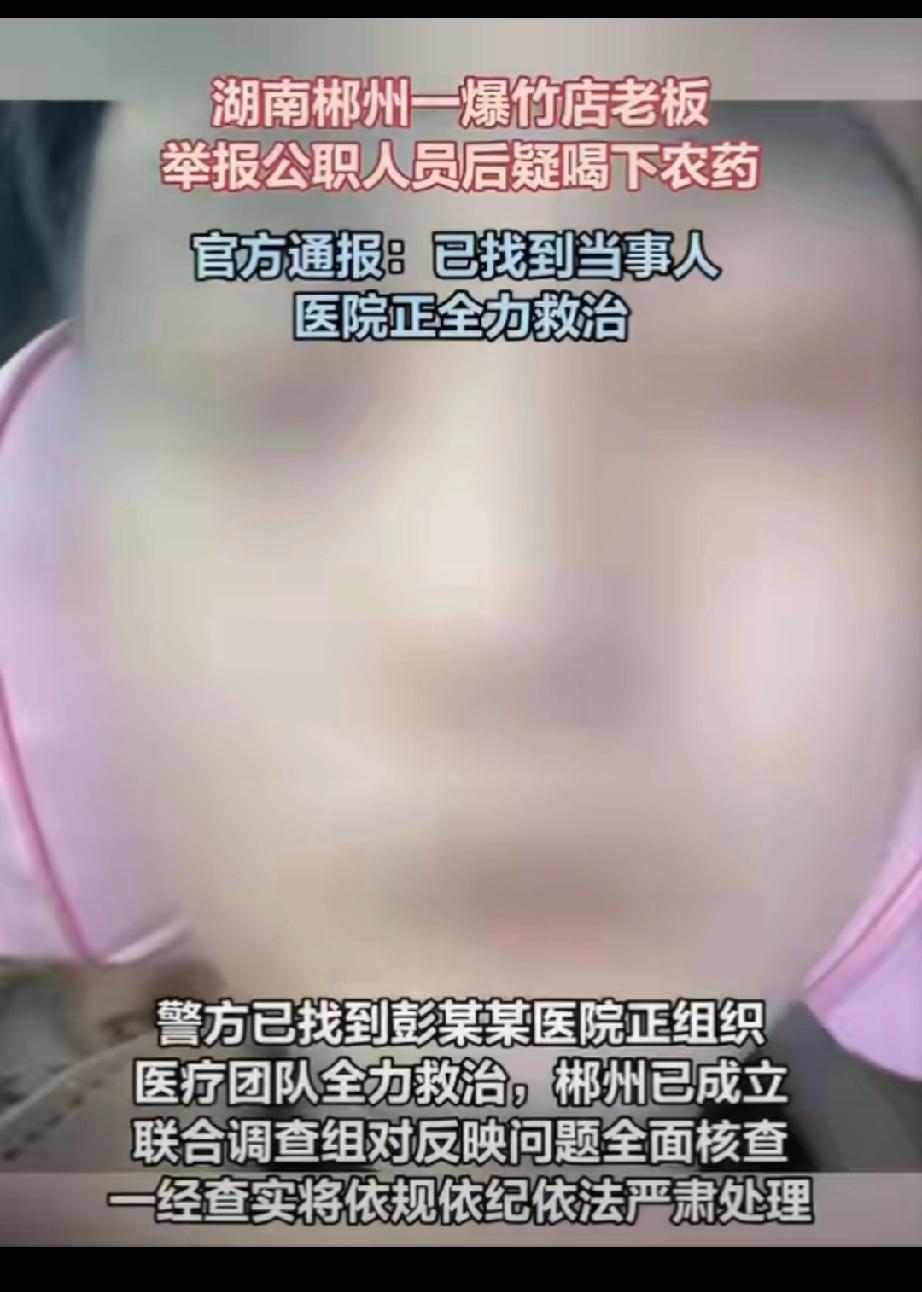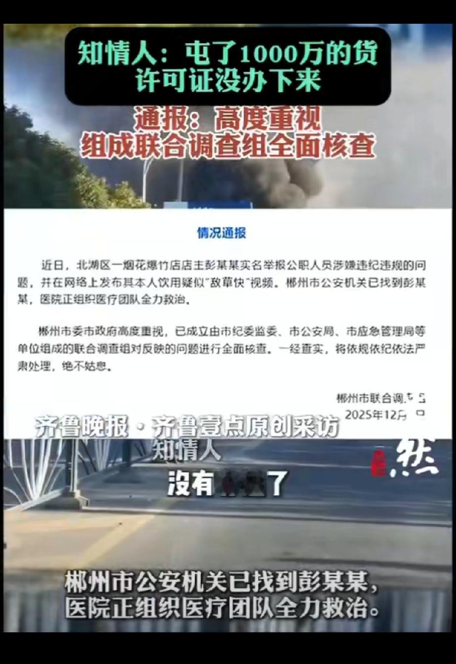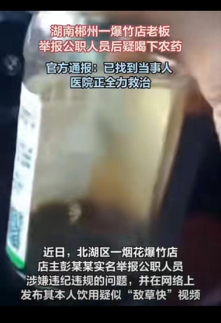 湖南郴州一烟花爆竹店燃爆后续:店主曾举报公职人员涉嫌违纪违规问题并发布饮农药“敌草快”视频,官方通报现已找到店主彭某某并全力救治中。知情人称:屯一千万元烟花办证受阻。 湖南烟花事故 郴州烟花事故
