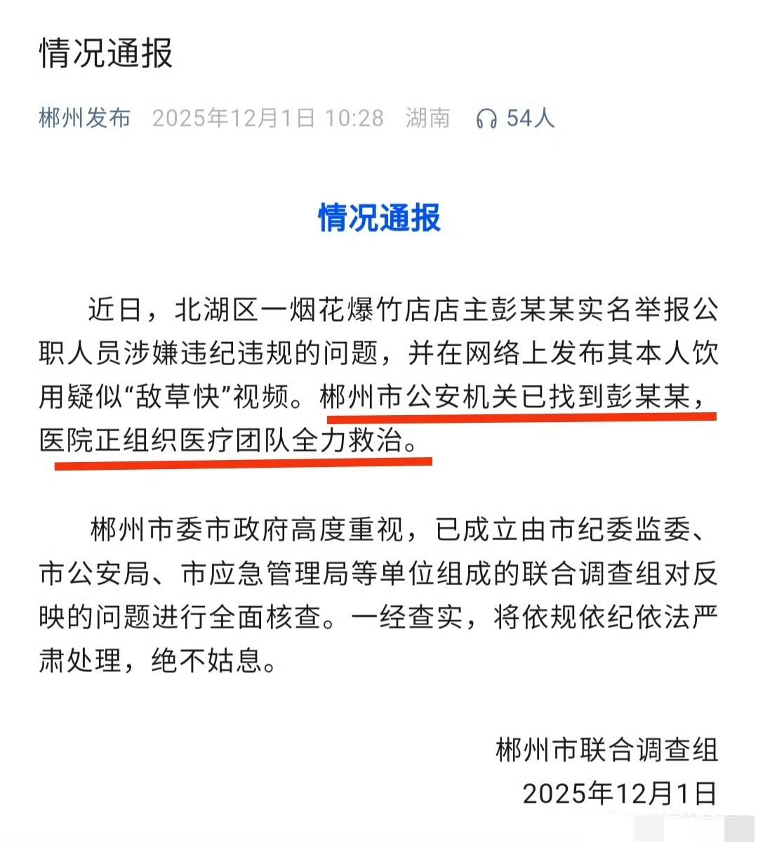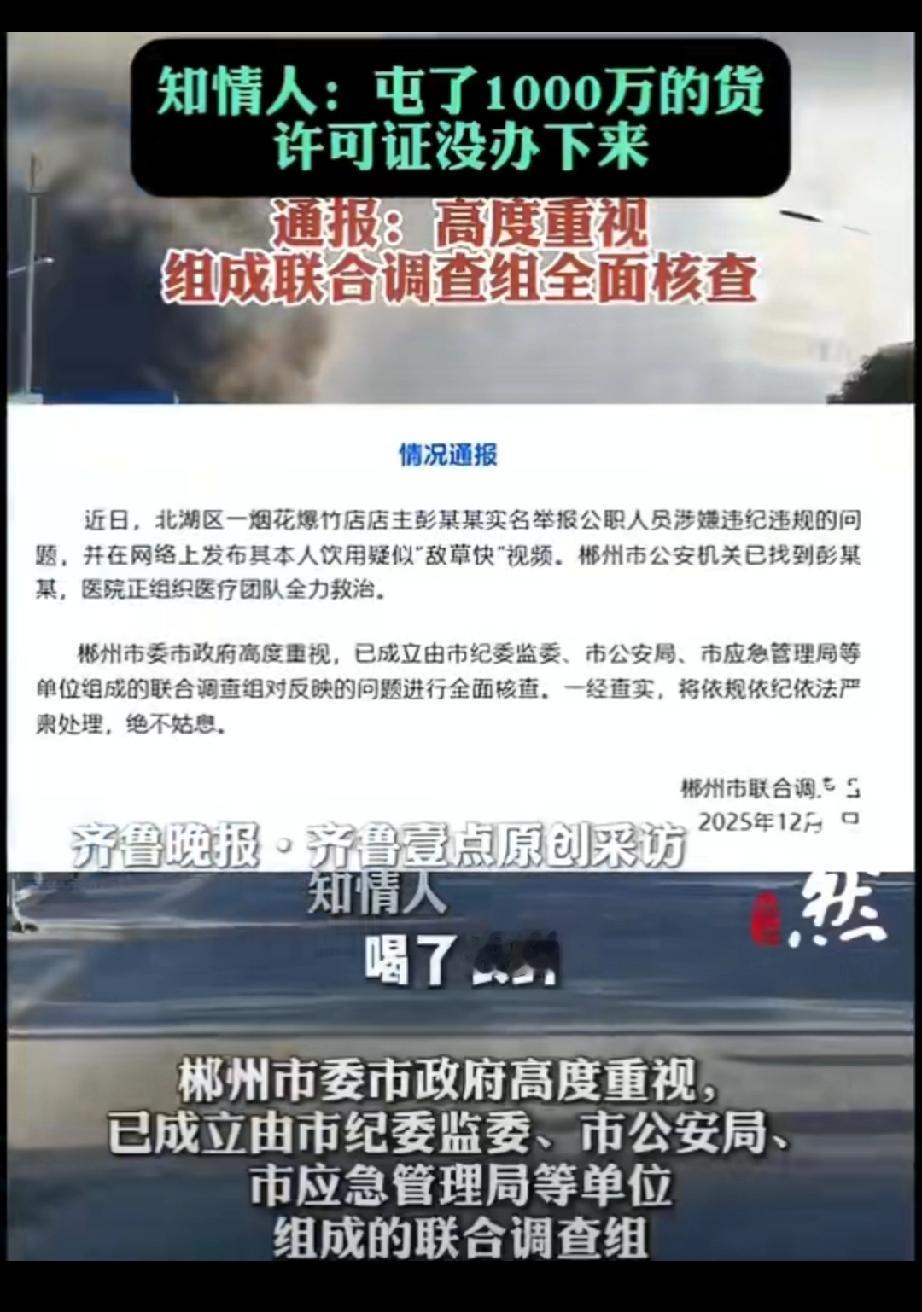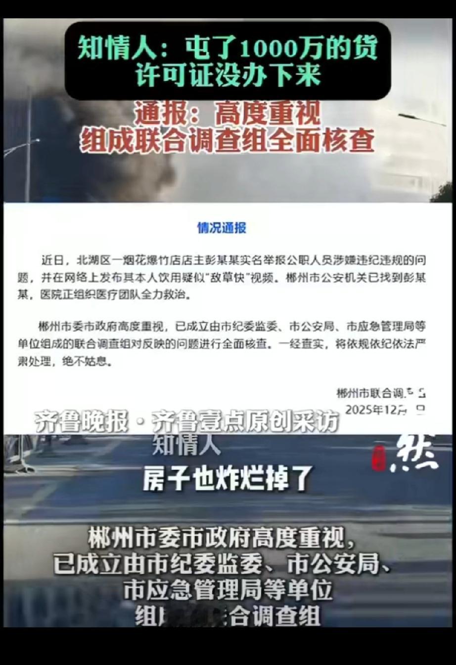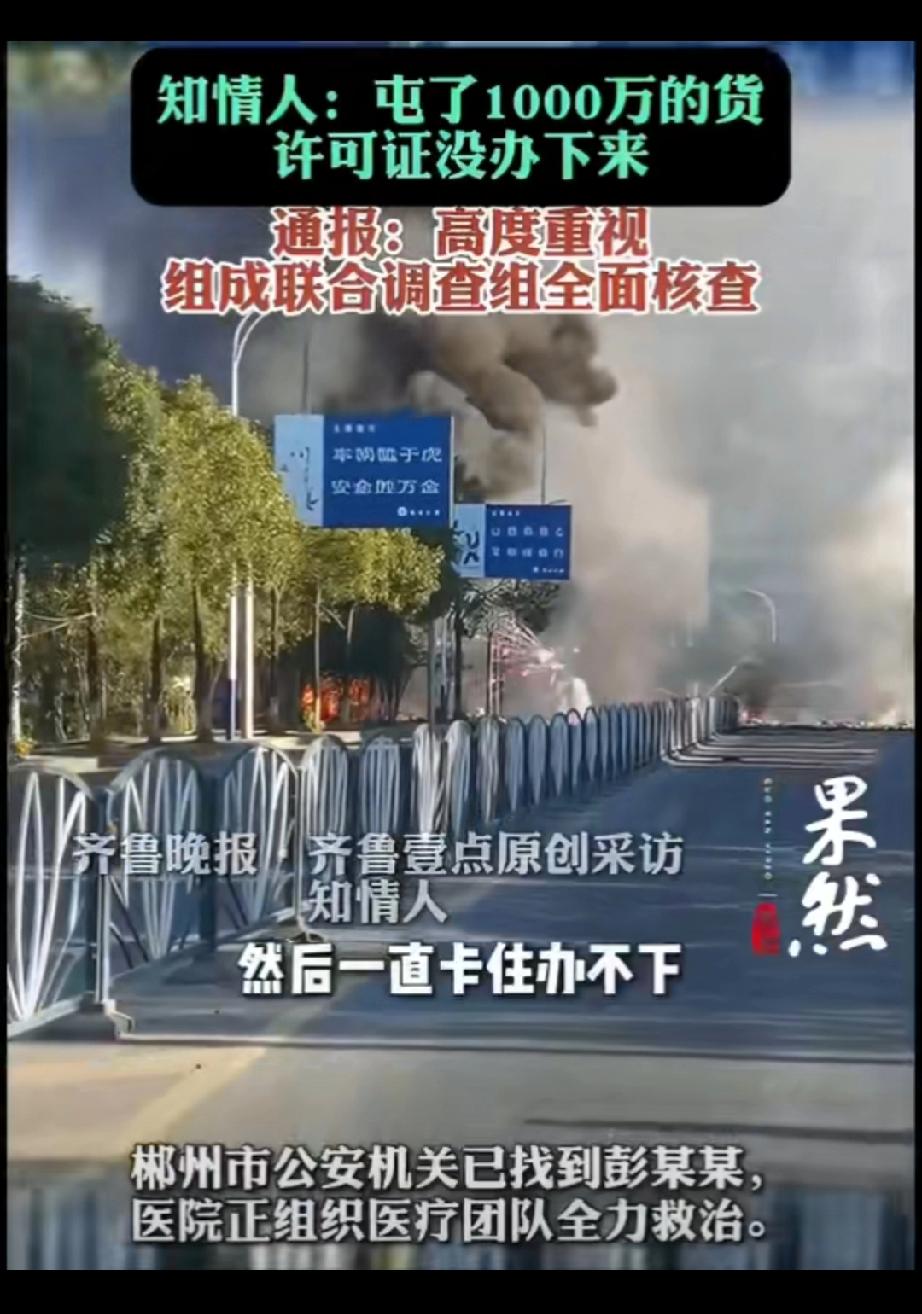湖南郴州一烟花爆竹店燃爆后续:店主曾举报公职人员涉嫌违纪违规问题并发布饮农药“敌草快”视频,官方通报现已找到店主彭某某并全力救治中。知情人称:屯一千万元烟花办证受阻。 湖南烟花事故 郴州烟花事故