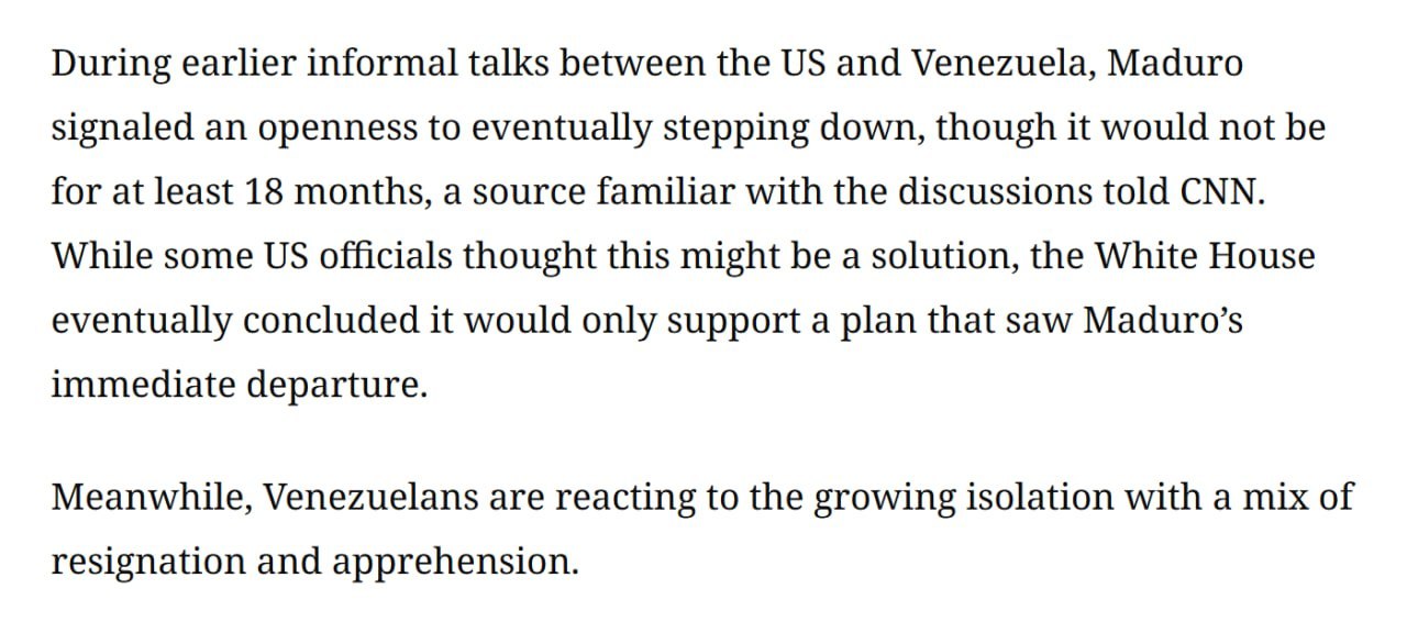据美国有线电视新闻网(CNN)报道,委内瑞拉总统尼古拉斯·马杜罗此前在与美国的非正式会谈中表示,他可能愿意下台,但至少在18个月内不会。一些美国官员最初认为这是一个可行的方案,但白宫最终决定只支持要求马杜罗立即下台的方案。海外新鲜事热点现场