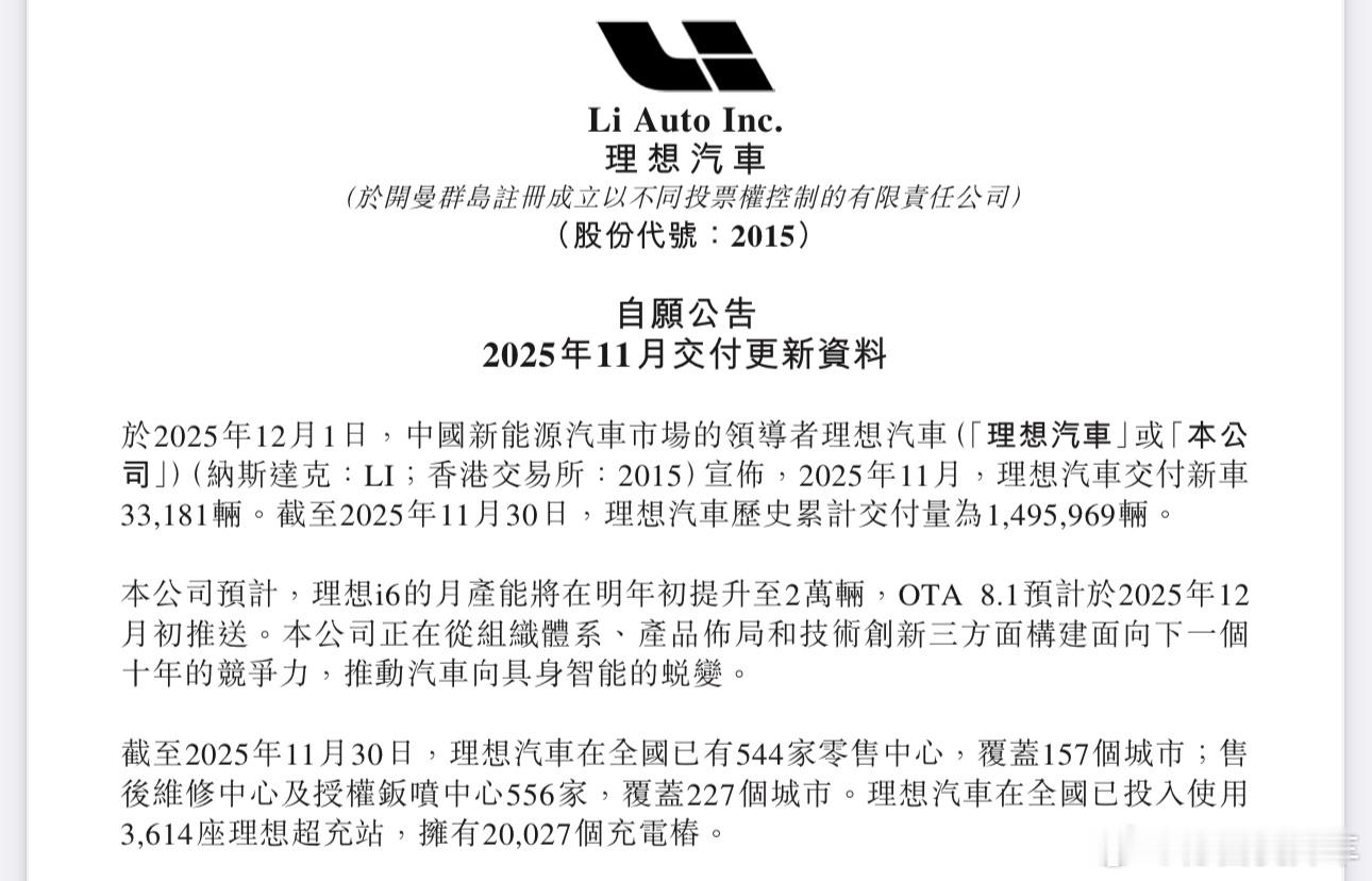 理想 11 月份交付 33181 辆,今年 1-11 月交付 363097 辆,截止目前建成 3636 座超充站,12 月份将推送 OTA 8.1 软件版本,2026 年初 i6 月产能将拉到 2 万台。理想汽车理想i6新能源汽车
