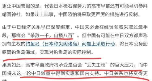 中国极有可能采取实控钓鱼岛,反制高市早苗!12月1日,联合早报刊文表示,日本外长茂木敏充在回应媒体有关台湾问题是否属于中国内政时直接说:“我的理解和你不一样”。这句话的潜台词就是不承认台湾问题是中国的内政。各种迹象表明,高市早苗并无意收回此前针对中国的过激言论。 联合早报认为,高市早苗作为日本极右翼代表,很可能还会进一步挑衅,比如参拜靖国神社。这一举动若发生,将引发中方采取更强硬甚至实质性的行动。 经济制裁虽然能打击日本,但对中方自身的产业和市场也会造成不小的冲击,属于两败俱伤的手段,因此,一种更精准且成本更低的反制方案,就显得尤为重要。 钓鱼岛问题在中日关系中长期存在。钓鱼岛及附属岛屿自古就是中国领土,但在上世纪的历史变动中,日本试图巩固所谓的管控。 近年来,中国海警船在钓鱼岛海域常态化巡航,打破了日本单方面控制的局面,如果进一步驱离日本公务船,建立排他性的执法和管理,就意味着中国实现了真正的“实控”。 对于日本而言,钓鱼岛不仅是一片争议海域,更是民族主义的象征。一旦失去海域的所谓管辖权,反对派会借此向激进势力施压,高市早苗的政治地位也会受到严重冲击。这种后果,对她这样的政治人物来说,几乎是无法承受的。 参拜靖国神社是另一道红线。靖国神社供奉有二战中的甲级战犯,其象征意义早已超越历史层面,成为检视日本如何对待战争历史的重要标尺,每一次参拜,都是在挑衅历史记忆和地区秩序。 如果高市早苗真的选择在国际舆论强烈反对的背景下参拜,那将等于在中日之间卸掉最后一道缓冲墙,届时,中国的反制行动势必会进入更直接、更强硬的阶段。 而在更大的国际背景中,美国的态度不得不被纳入考量,美国声称不对钓鱼岛主权归属表态,但同时确认《美日安保条约》适用于钓鱼岛,这意味着一旦该地区发生冲突,美国很可能介入。 从近期的中美关系看,双方都有缓和意向,中国会在权衡利弊后选择最佳时机采取行动,确保既能反制日本,又不至于让中美关系陷入急剧下滑。 说到底,事情的发展不只取决于中国的决心,还看日本右翼会否继续越线,如果高市早苗能收回挑衅言论,并放弃一些极端做法,中日关系或许还能保持稳定,但若她执意一条路走到底,那么钓鱼岛的局势将很可能彻底转向,中国的实控也会随之到来。