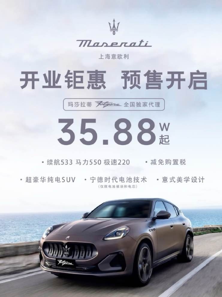 【玛莎拉蒂狂降54万?过去对标保时捷,如今对标小米!老车主破防】近日,多地玛莎拉蒂门店社交媒体发布海报称,玛莎拉蒂的纯电SUV车型Grecale Folgore售价35.88万元起。该款车型官方指导价89.88万元,经销商报出的35.88万元较指导价降了54万元。车主纷纷表示,这让老车主的脸往哪搁?有网友调侃称,「只要活得久,你甚至能看到35万元的玛莎拉蒂」、「玛莎拉蒂也是好起来了,能和小米平起平坐了」、「再不努力,只能开玛莎拉蒂了」。汽车玛莎拉蒂热点观察室汽车热点观察室车圈新鲜事