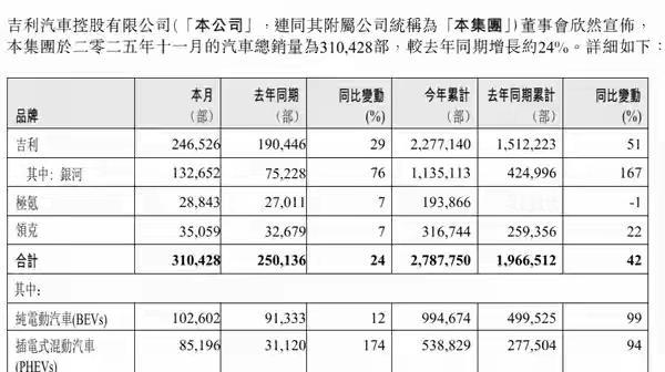 不服不行! 11月,极氪全球销量2.88万辆 11月,领克全球销量3.5万辆 11月,吉利银河全球销量13.27万辆,同比暴增76%,2025年累计销量已经高达113.5万辆,同比增长167%。 2025年11月吉利汽车总销量31.04万辆,再次刷新记录,同比增长24%。 吉利汽车1-11月累计销量高达278.78万辆,同比增长42%,吉利汽车将成为比亚迪之后第二个年销量突破300万的国产车企。 11月份新能源汽车销量18.78万辆,占比60%,也是头部传统车企里转型最快的。 不得不说,吉利汽车逐渐成为比亚迪国内最大的竞争对手,几款银河车型更是凭借更高的性价比销量超过了比亚迪竞品。这也是比亚迪最近几个月国内销量下滑的原因。2025广州国际车展 吉利汽车现在豪华品牌有极氪,高端品牌有领克,还有走量的银河品牌以及传统燃油车型。如果算是沃尔沃 路特斯等控股品牌,吉利集团有机会成为世界前五的车企。