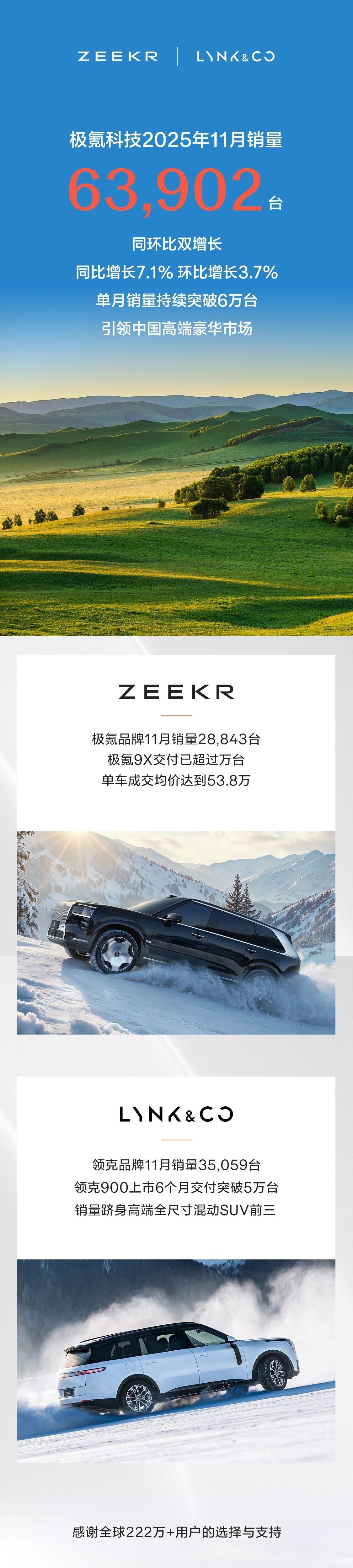 极氪科技11月销量,63902台其中极氪28843,领克35059新能源大牛说