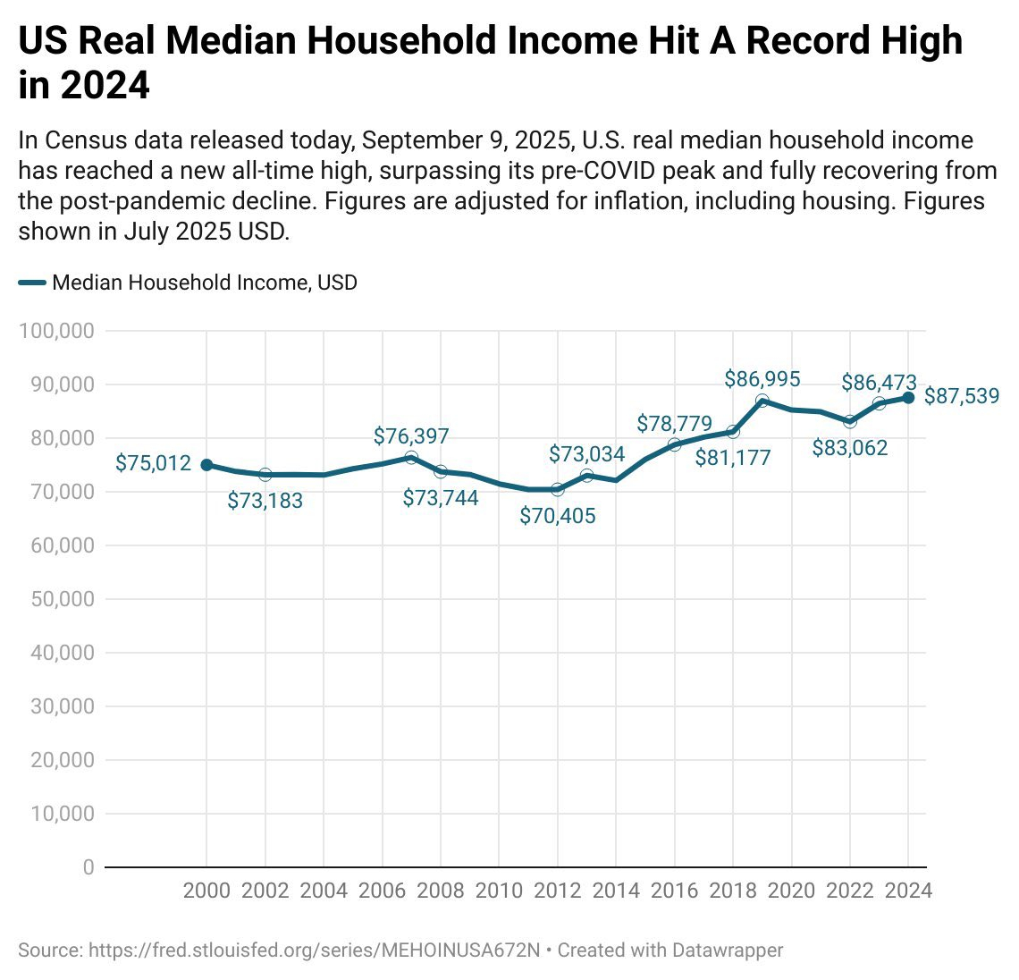 2025 年 9 月 9 日发布的人口普查数据显示:2024 年美国实际家庭中位数收入(已按通胀调整,含住房成本,以 2025 年 7 月美元计)创历史新高