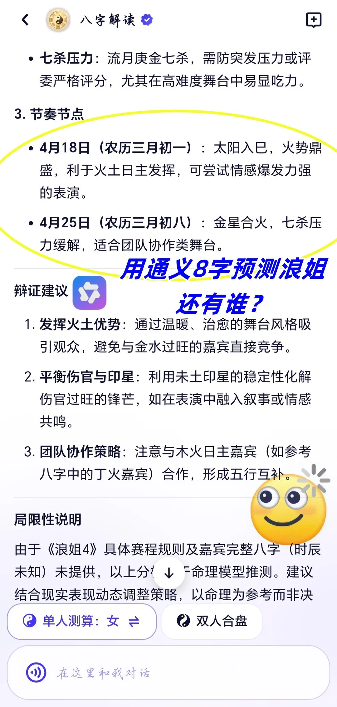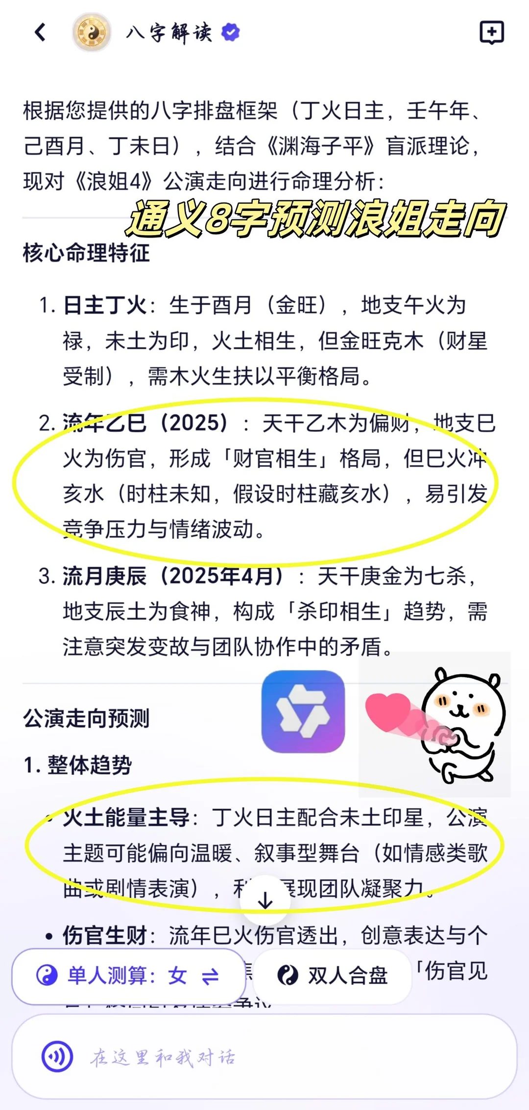 ‼️而且根据通义8字给出的推测,流年巳火伤官透出,创意表达和个人特色会更加吸引评委和观众,成为主要的竞争点
