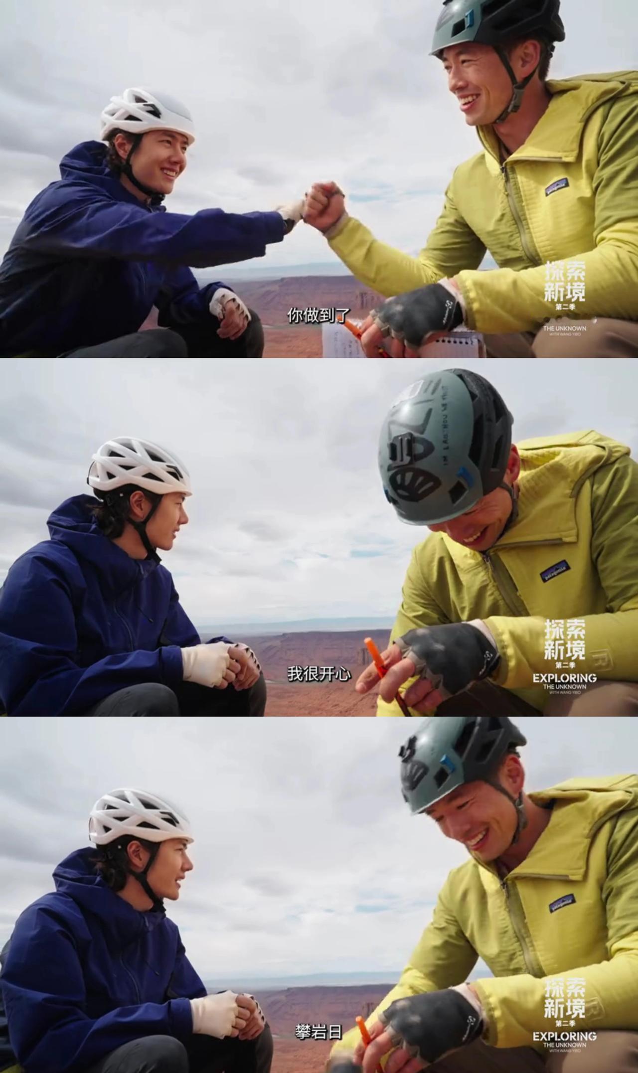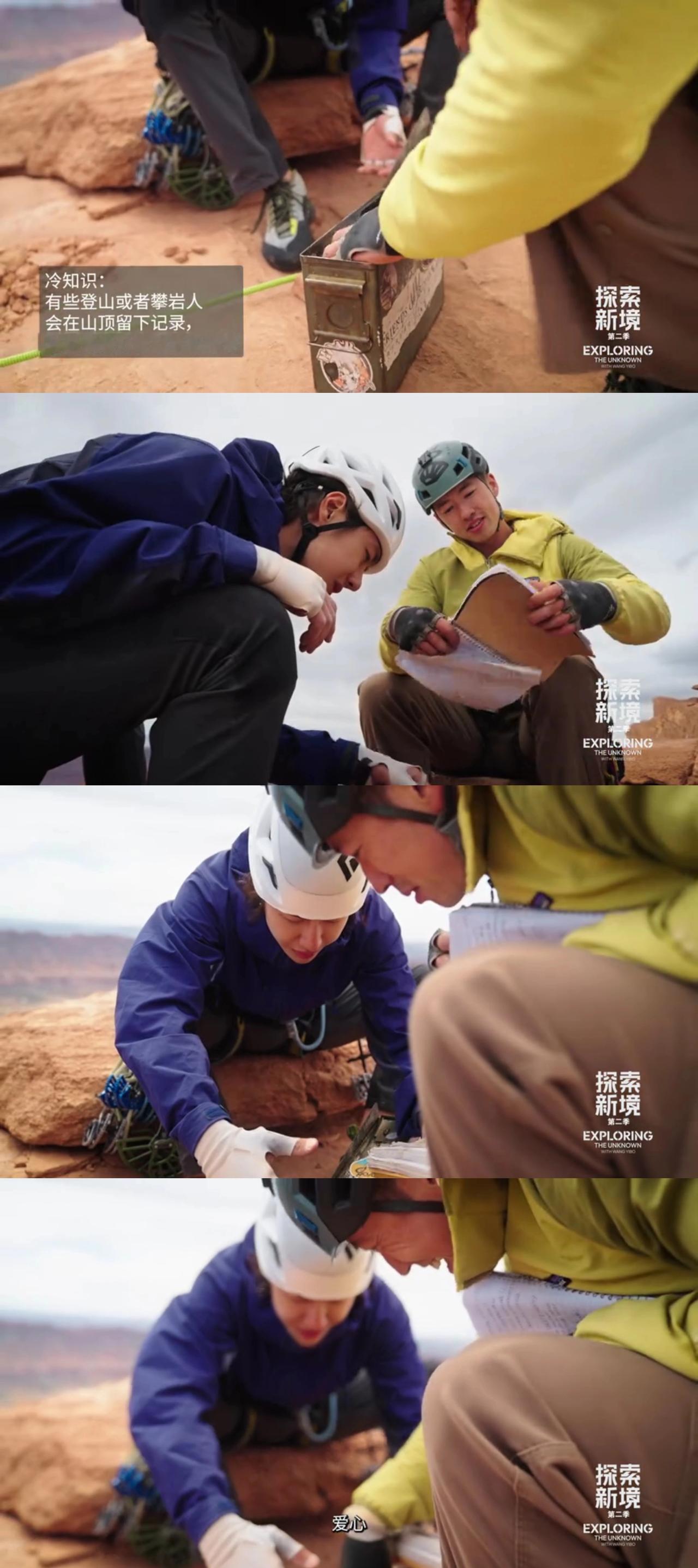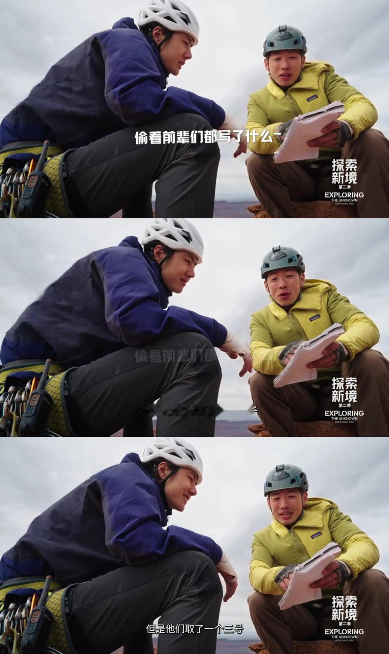 王一博和史瑞德搭档,攀岩登顶卡斯尔顿塔,原来塔顶之上还有一份意外的“浪漫”。 高塔之上,有着前辈攀登者都会留下的山顶记录“签名簿”。哈哈,两个童心未泯“调皮”的大男孩儿还看了看前辈们都写下过什么[捂脸]。 然后,瑞德记录下了王一博的“第一个”——“他(王一博)第一次爬一个5.11难度的结组”。 所以,手里拿着笔的王一博会写下点儿什么呢? 顶峰相见,从来都只属于真正的强者们。 ps:来看看前辈们提到的六号塞子什么样儿,原来就是那个跟王一博的头差不多一样大的[笑哭]。 王一博 王一博探索新境2