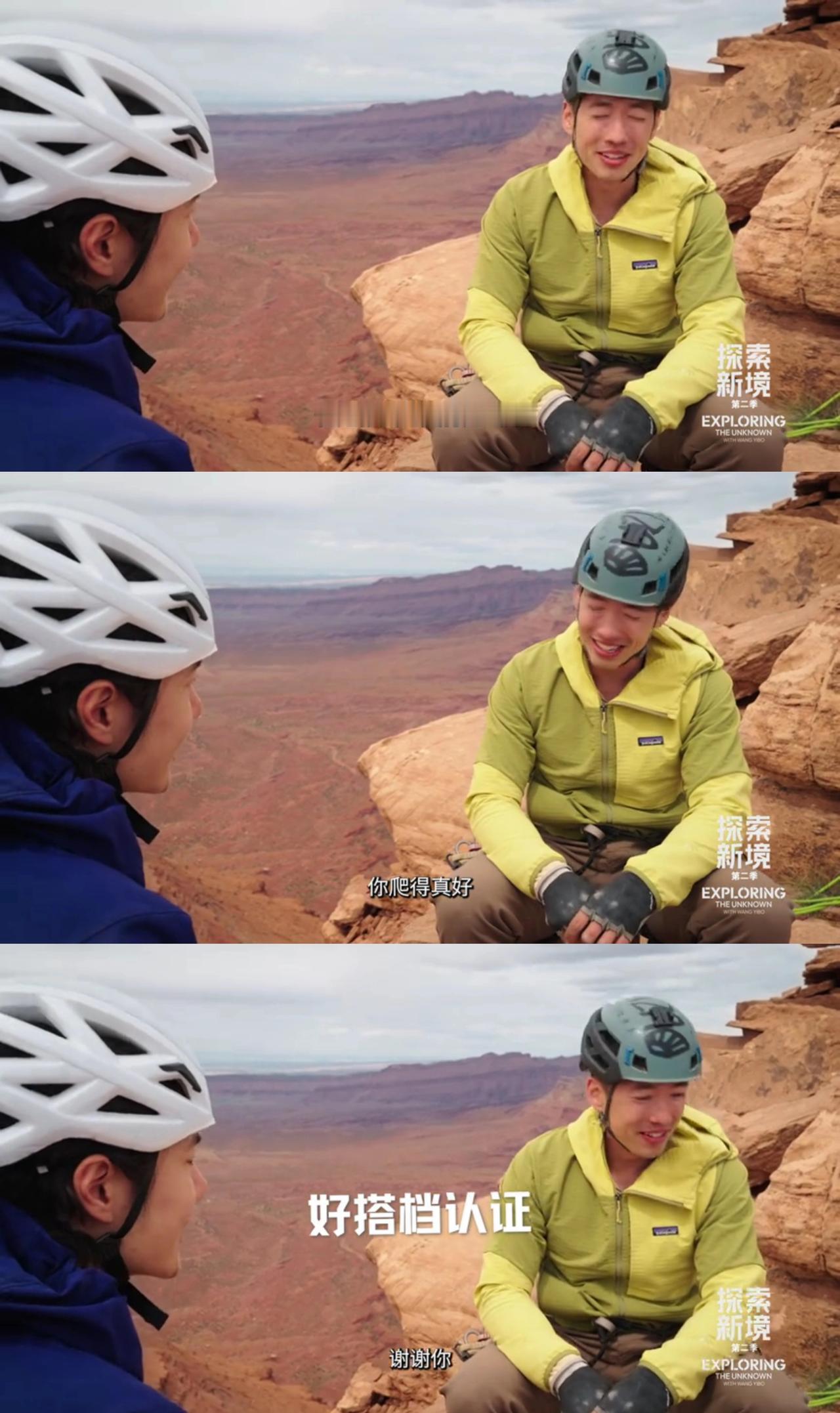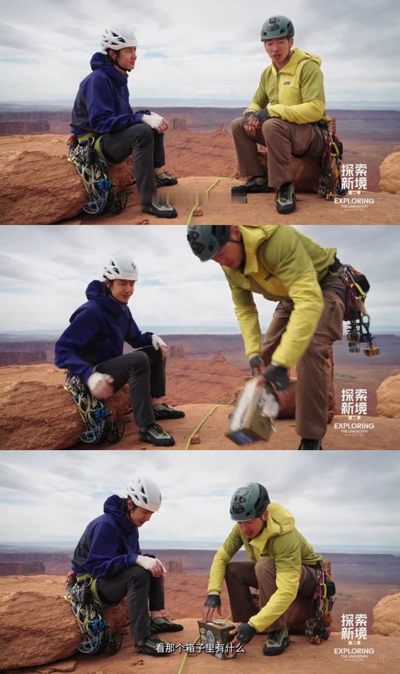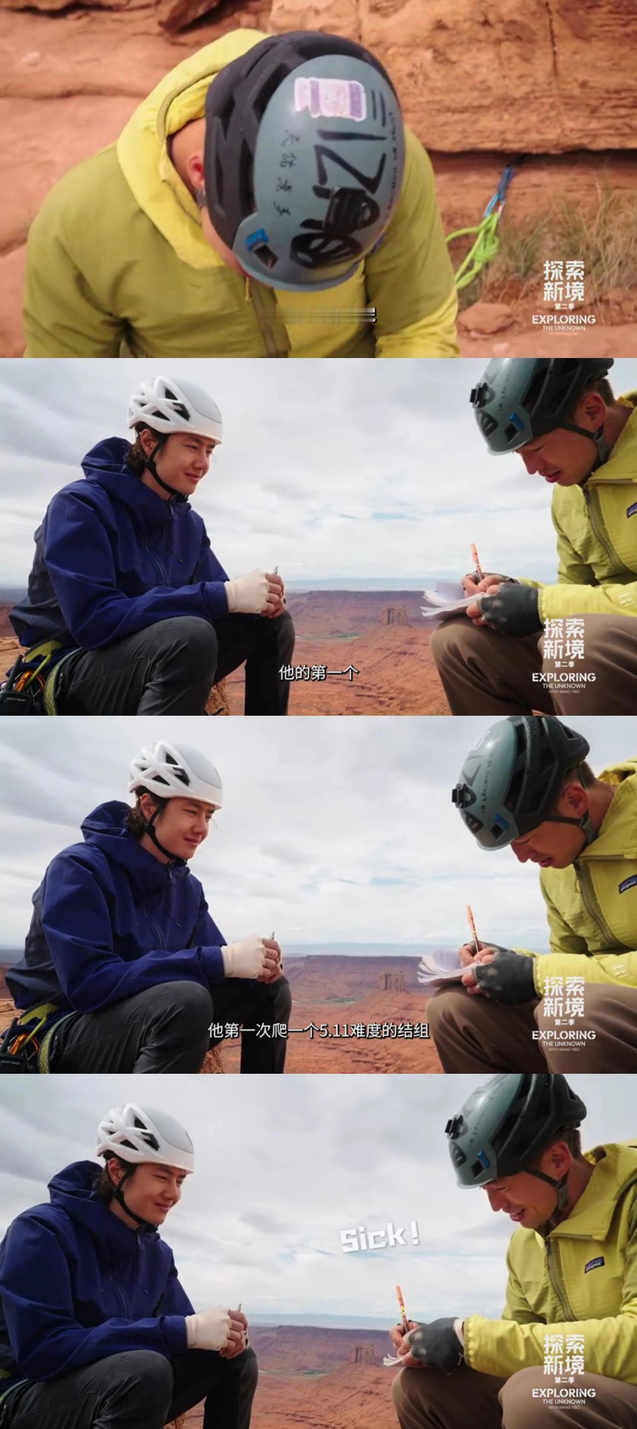 王一博和史瑞德搭档,攀岩登顶卡斯尔顿塔,原来塔顶之上还有一份意外的“浪漫”。 高塔之上,有着前辈攀登者都会留下的山顶记录“签名簿”。哈哈,两个童心未泯“调皮”的大男孩儿还看了看前辈们都写下过什么[捂脸]。 然后,瑞德记录下了王一博的“第一个”——“他(王一博)第一次爬一个5.11难度的结组”。 所以,手里拿着笔的王一博会写下点儿什么呢? 顶峰相见,从来都只属于真正的强者们。 ps:来看看前辈们提到的六号塞子什么样儿,原来就是那个跟王一博的头差不多一样大的[笑哭]。 王一博 王一博探索新境2