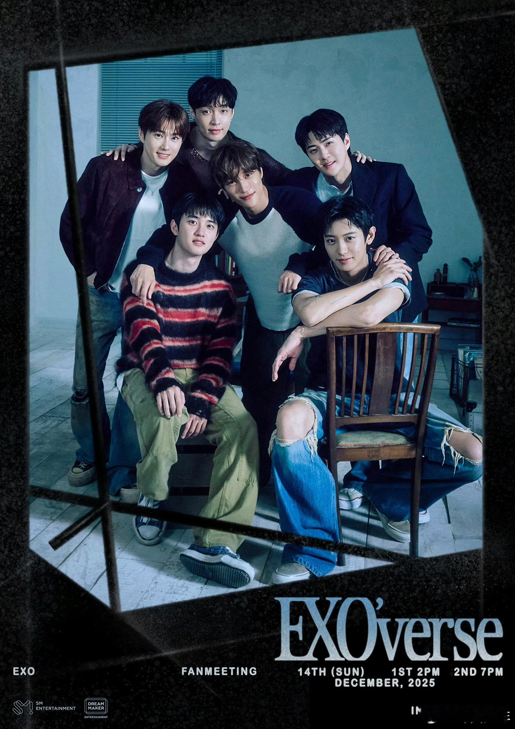 EXO2025粉丝见面会海报 EXO2025粉丝见面会海报正式公开,金俊勉、朴灿烈、都暻秀、金钟仁、吴世勋、张艺兴六人阵容确认,这场名为“EXO’verse”的见面会即将启幕。