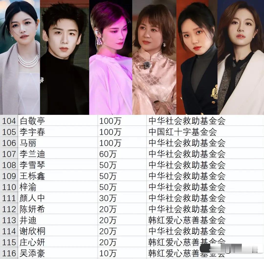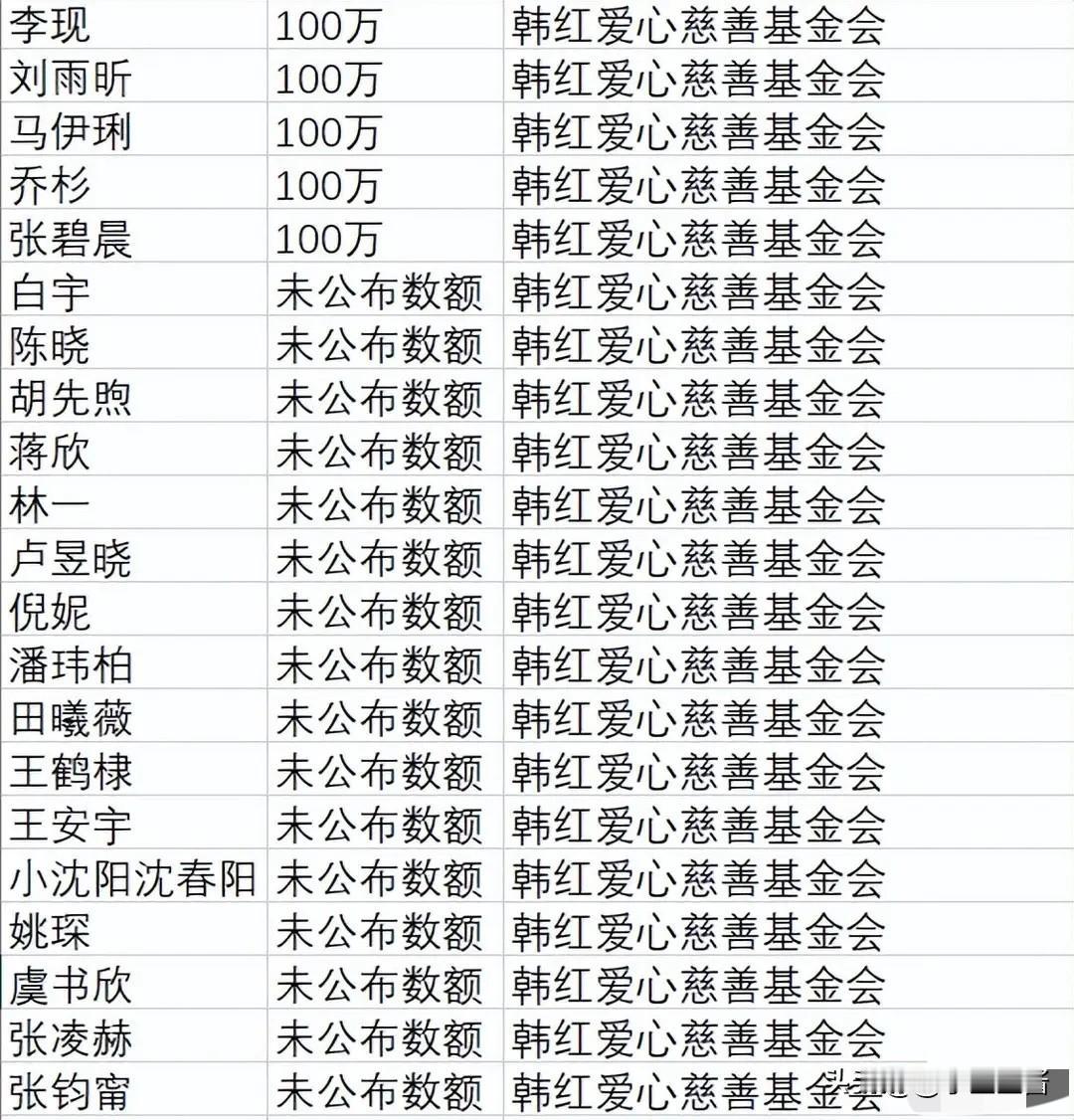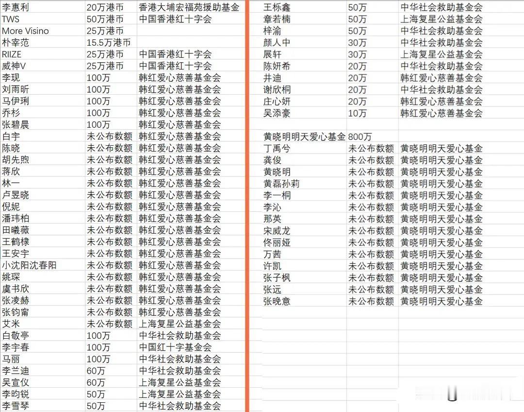 明星捐款一览: 130位艺人,共同为香港捐款,总金额高达9000万,用于灾后重建,捐款不分大小,每一位贡献爱心的明星都让人佩服。 其中,韩红爱心慈善基金会,人数最多,一共34位艺人,捐出了2035万,谢霆锋的锋味,捐出500万,黄晓明的爱心基金会,也不甘落后,捐出了800万人民币。 捐款名单上,除了当红明星,还有不少让人意外的,比如网红易梦玲等。 当然,也有一些明星,并未公布捐款金额,应该也是为了防止被“网暴”吧。 除了捐款,首批物资已抵达香港。 看样子,大埔区的建设,应该会很快完成,为国人的速度点赞。[赞]