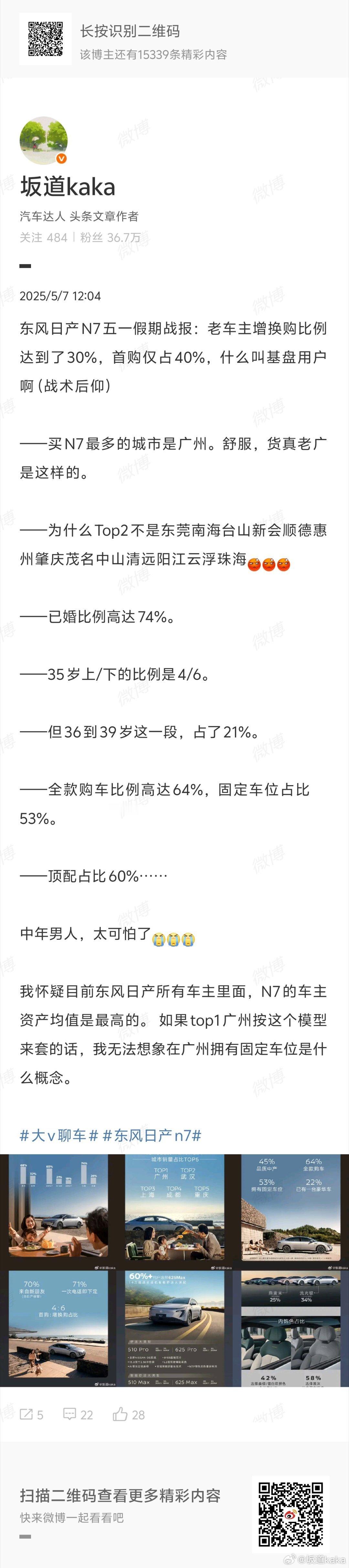 东风日产N6订单情况:首购用户占比80%,有35%是女性用户,年龄区间大部分在25-35岁。作为对比:东风日产N7,已婚比例高达74%。35岁上/下的比例是4/6。——但36到39岁这一段,占了21%。全款购车比例高达64%,固定车位占比53%。顶配占比60%。两个车,虽然都是东风日产新能源车,但客群区别极大,大家猜猜这是为什么?百万级后排大沙发大v聊车