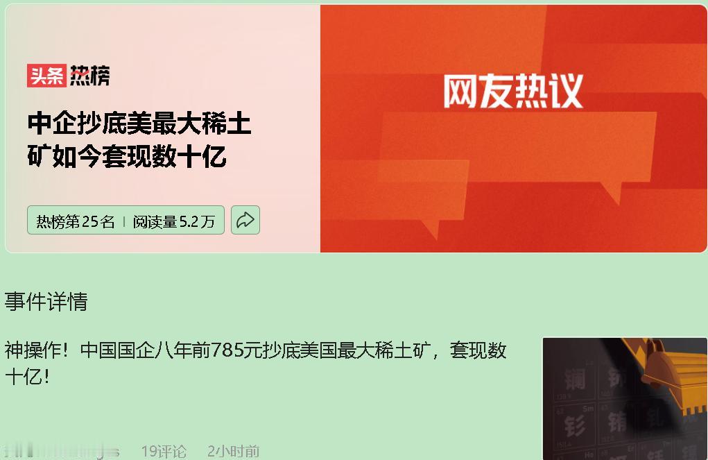 十年前,有人用785万买下了一座美国稀土矿。当时所有人都说:这钱,怕是要打水漂。 矿场叫芒廷帕斯,藏在加州沙漠里。曾经供应全球,可那会儿刚破产,负债累累,像个没人要的破铜烂铁。 故事在2025年变了天。 美国人兴高采烈地挖出了矿,结果发现一个扎心事实:他们只会挖矿,不会提纯。全球九成的加工技术捏在中国手里,那些挖出来的石头,还是得千里迢迢运到中国处理。 关税一加,直接卡了脖子。矿场停摆,股价跳水。而当初投资的中国企业呢?早就通过股权退出和高价订单,赚得盆满钵满。 这事儿挺让人感慨的。 以前,西方矿商总抱怨我们把稀土价格压得太低,说我们搞垄断。可我们就是咬着牙,把从挖矿到磁铁、从零件到整车的整条产业链都做全了。 你刚想竞争,我就增产降价,利润压到最低,逼着你退出。等你退出了,才发现整个市场都离不开我了。 现在美国急了,F-35战机、导弹系统,八十七%的稀土依赖我国进口。五角大楼砸钱想自己重建产业链,专家说:得十年。 可十年?黄花菜都凉了。我们连稀土回收技术都玩得出神入化,成本又降一大截。西方想追,连尾灯都看不见。 785万买的不是矿,是一张门票。 这场棋局教会我们:真正的安全感,从来不是手里有矿,而是手艺在身。把饭碗端稳了,比什么都重要。