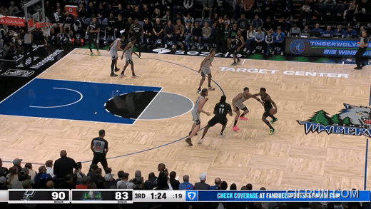 今天华兹对马刺,32分。图1,一步突破抢身位,急停拉球变向,直接划过索汉上篮——和昨天那个拉球一样,急停急起。图2,在戈贝尔和科内特阻塞空间时,弧线突破到篮下,跳传底角——这球亚历山大也擅长。图3,突破急停轻推,变向肩扛要犯规后抛出——这球是吉米·巴特勒的专长。2024年他还是强突硬上硬投居多;上季是好容易练出了三分球,于是狂飙远射。本季至今,急停急起变向更从容了。然后是集大成的一球:以往他出了名的不会破夹击,今天图4面对夹击,加速摆脱奥利尼克到底角,从容背后运球变向,直穿篮下滞空上篮——一穿三。季前30天30队提的,有跟了爱德华兹中国行的朋友跟我说:【爱德华兹极自律,从饮食到运动;他日程拉满,睡觉时间之外就是工作,但还是带了训练师;偶尔吃完饭,会忽然跟保镖/训练师“来25!”然后俩人就地做25个俯卧撑之类。去年休赛期,他苦练三分;今夏,他也在练一点东西——背身,篮下,脚步,尤其是脚步。2024西决爱德华兹输给了卢卡——卢卡五场23个三分球,华兹自己五场13个三分球——于是华兹2024年夏天苦练,2024-25季全年射进单季320个三分球(只有库里和哈登单季中过更多)。2025西决他输给了亚历山大——全系列赛他14个中投23个助攻,亚历山大29个中投41个助攻——夏天他说苦练,看了许多乔丹与科比的录像带。这个热血笨蛋认死理:也许他真的什么都练得出来。】今天华兹对马刺32分后,本季场均29分联盟第七,西部仅次于三大魔王。效率49%+41%+83%。真命中率62%——而且三分还投少了。完全是靠对抗要罚球、更准的二分球、急停急起,把效率往上提。他真的练出来了。爱德华兹马刺vs森林狼