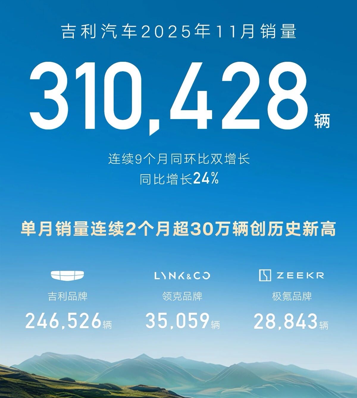 日前,吉利汽车官宣:11月销量达31.04万辆,创历史新高,连续9个月同环比双增长。具体来看,吉利品牌单月销量达24.65万辆,领克品牌单月销量达3.5万辆,极氪品牌单月销量达2.88万辆。值得一提的是,新能源单月销量达18.77万辆,同比增长53%。