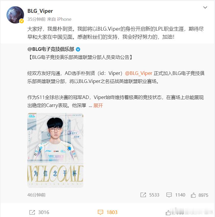 你也喊“老公”是吧在Viper回应重返LPL的博文下,Tarzan回复Viper:老公来了GRF二人组在LPL重聚咯~Tarzan回复ViperViper回应重返LPLBLG官宣Viper加入