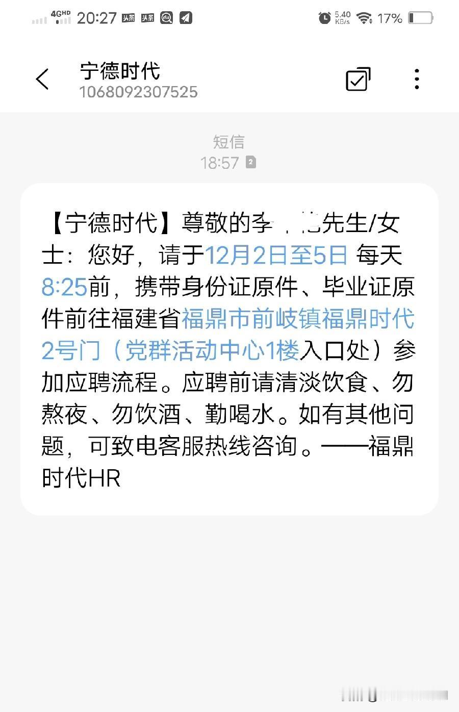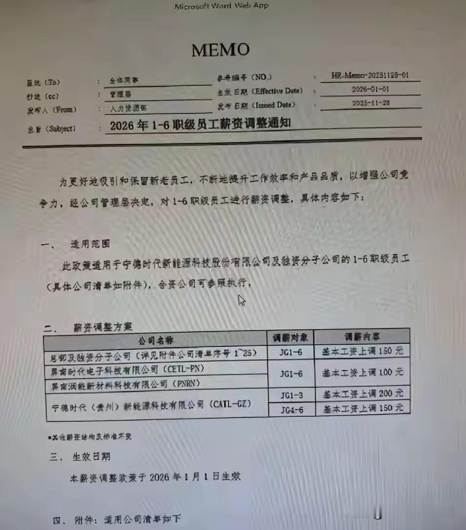 我今天收到宁德时代入职培训通知 在考虑要不要去 想想两个月倒一次夜班就有点害怕😱 听说 宁德时代发布涨薪通知:自2026年1月1日起,对1-6职级员工的基本工资上调150元 来源 | 中国基金报 临近年底,宁德时代宣布涨薪! 12月1日,宁德时代发布涨薪通知的词条迅速冲上微博热搜首位,引发大量网友关注。 近期,多名网友爆料称,宁德时代发布《2026年1-6职级员工薪资调整通知》。根据通知,为更好地吸引与保留新老员工、不断提升工作效率和产品品质,宁德时代决定自2026年1月1日起,对1—6职级员工的基本工资上调150元,其他薪资结构保持不变。 虽然单看涨薪金额并不算高,但网友纷纷表示,“有得涨就不错了”“总比没有强”。 亦有知情人士称,此次1-6级调整为“普调”,7级及以上还有望迎来“特调”。 Wind数据显示,截至2024年底,宁德时代在职员工的数量合计13.2万人,人均薪酬为23.63万元,较上年增长1.06万元。 业绩方面,2025年前三季度,宁德时代实现营业收入2831.72亿元,同比增长9.28%;归母净利润为490.34亿元,同比增长36.20%。 中国汽车动力电池产业创新联盟数据显示,今年10月,宁德时代以36.14GWh的装车量、43%的市场份额稳居榜首,是国内最大的动力电池供应商,在三元动力、磷酸铁锂动力方面均排第一。 12月1日,宁德时代A股尾盘拉升,收于382.97元/股,涨幅为2.62%,总市值为1.75万亿元。 近期报道显示,宁德时代和Stellantis(斯泰兰蒂斯)集团在西班牙阿拉贡自治区共同投资建设的磷酸铁锂电池工厂于11月26日举行奠基仪式。作为目前中国在西班牙最大的投资项目之一,该项目总投资41亿欧元,将全面使用可再生能源,计划于2026年年底投产。 12月1日,摩根大通发布研报称,基于最新数据点和对2026年全球ESS电池需求前景转趋乐观,叠加自动化、信息化、数据化驱动的长期需求,该行将宁德时代2026年盈利预测再上调10%至940亿元,较市场预测高出约10%。 此外,摩根大通将宁德时代A股目标价从480元上调至520元,称其为“全球最具估值吸引力的电池股”;将宁德时代H股评级上调至“增持”,目标价从575港元升至650港元。宁德时代 宁德电池价格 宁德时代上市